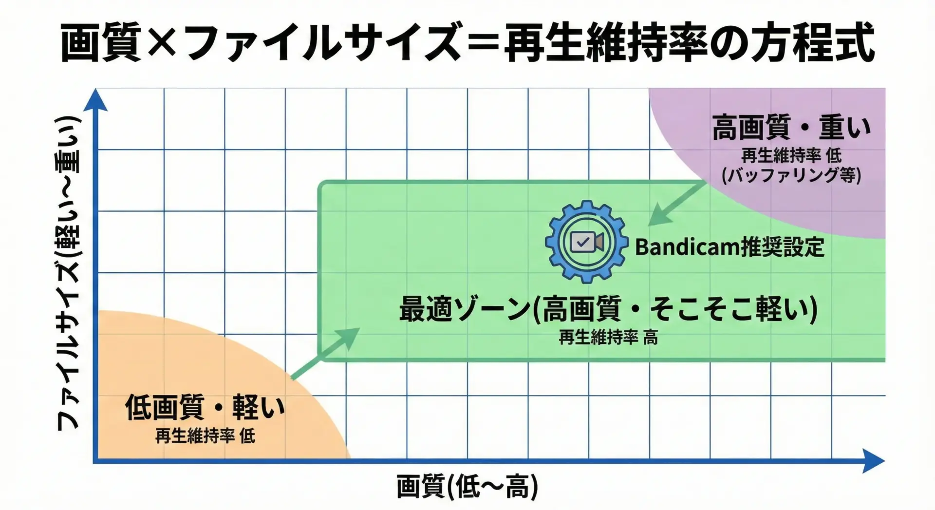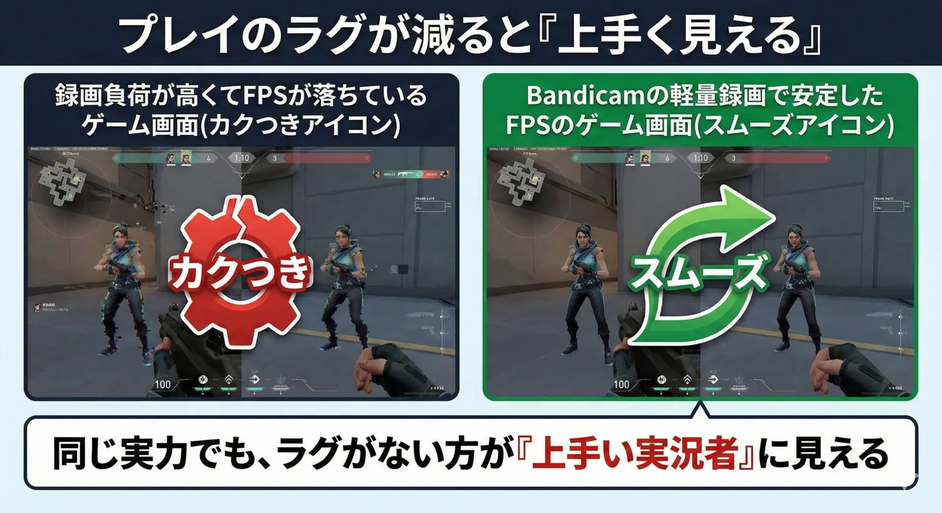 ゲームをプレイしながら録画するとき、負荷が高すぎるとカクついてしまい、プレイにも視聴体験にも悪影響が出ます。Bandicamは