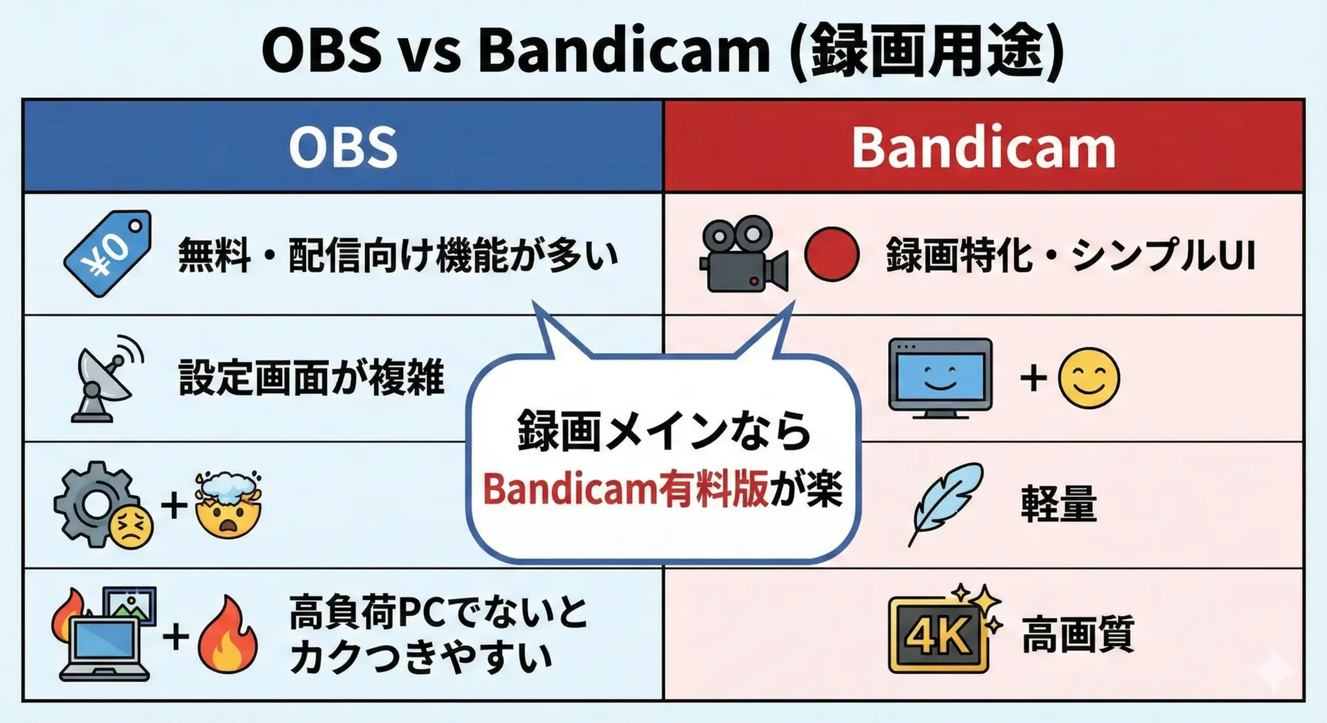OBSと比べたときのBandicam有料版のメリットを整理すると、次のようになります。