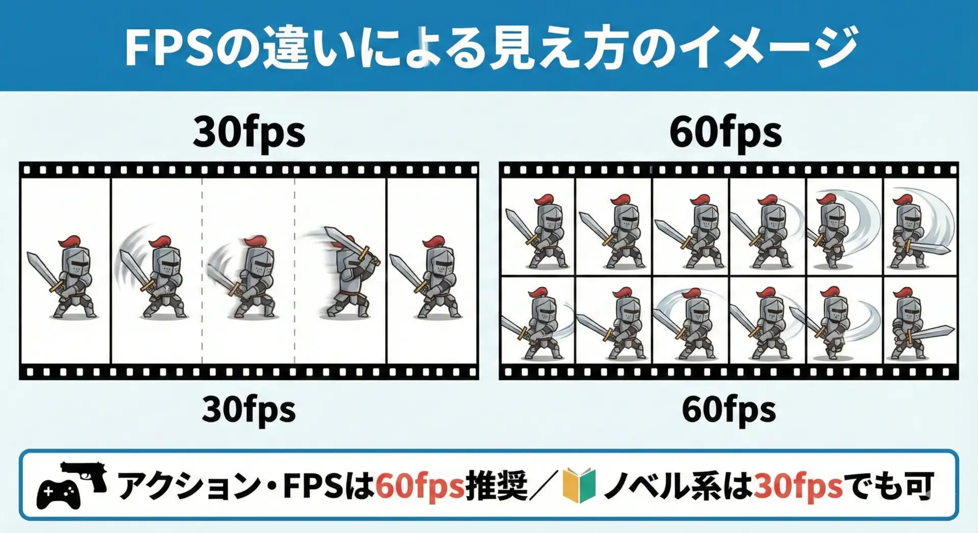 視聴者も動きの滑らかさを期待しているジャンルのため、30fpsだとカクついて見劣りしやすくなります。 - ノベルゲーム・シミュレーション・スローなRPG:30fpsでも十分