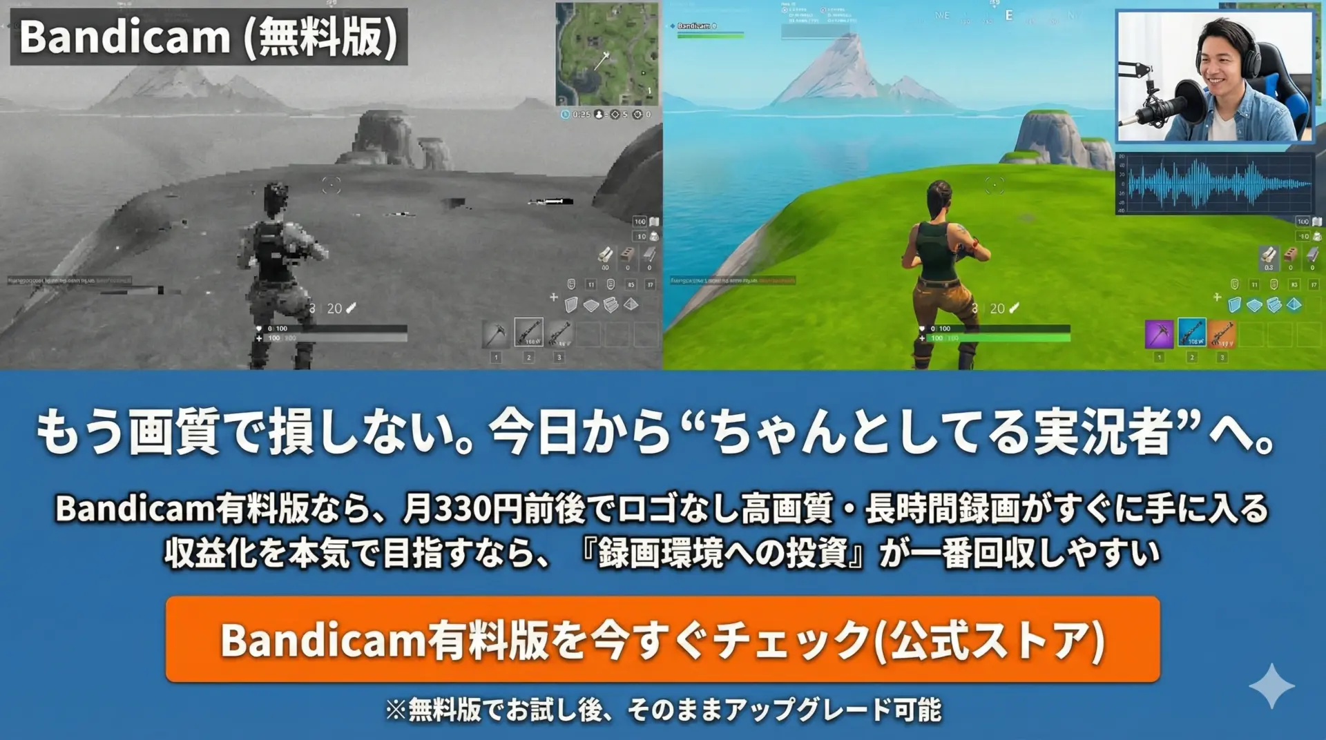 Bandicamは無料版でも録画自体はできますが、実況者として伸びたいなら有料版へのアップグレードはほぼ必須です。