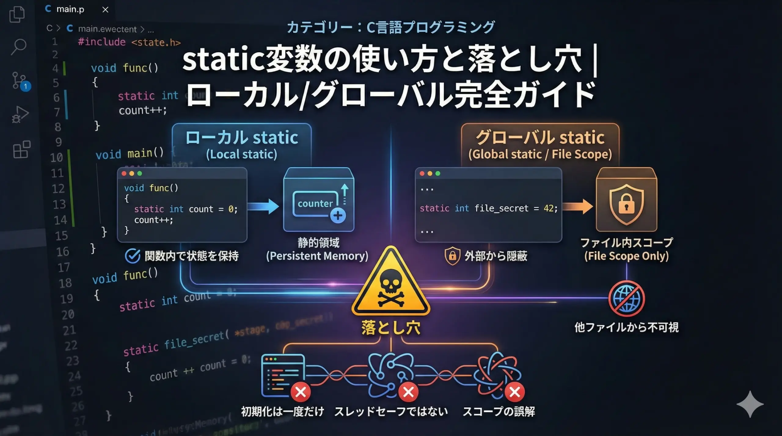 【C言語】static変数の使い方と落とし穴|ローカル/グローバル完全ガイド
