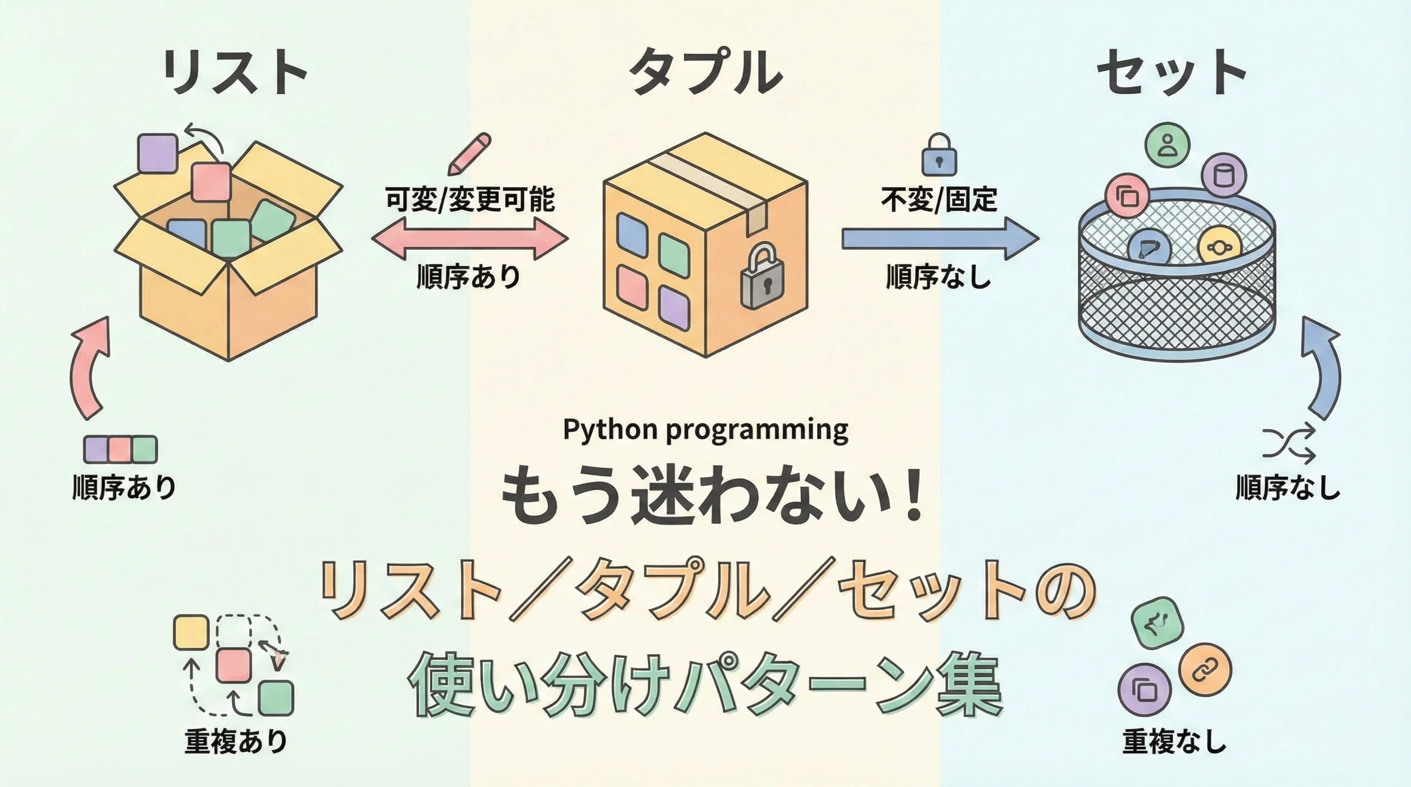 Pythonでプログラムを書くとき、リスト・タプル・セットのどれを使うか迷うことは少なくありません。 この…