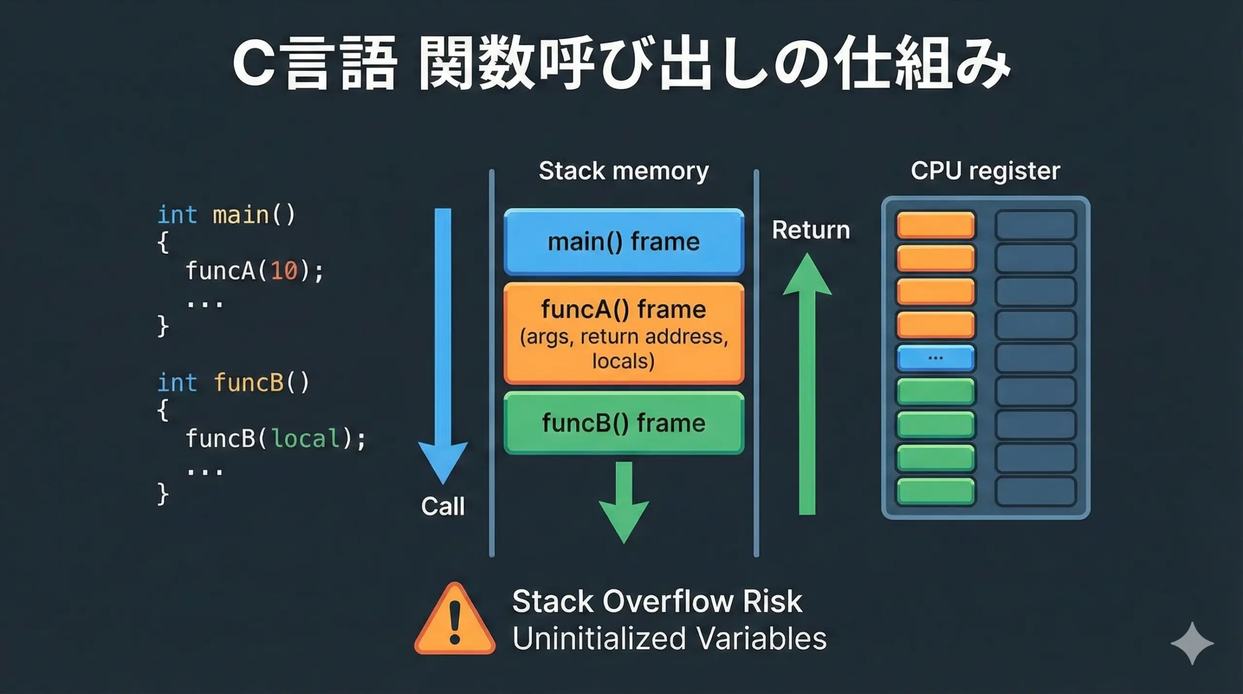 【C言語】関数呼び出しの基本と落とし穴|引数・戻り値・スタック動作を理解