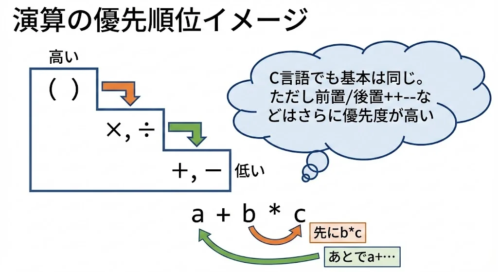 C言語の四則演算では、演算の優先順位と結合規則を理解しておくことが重要です。