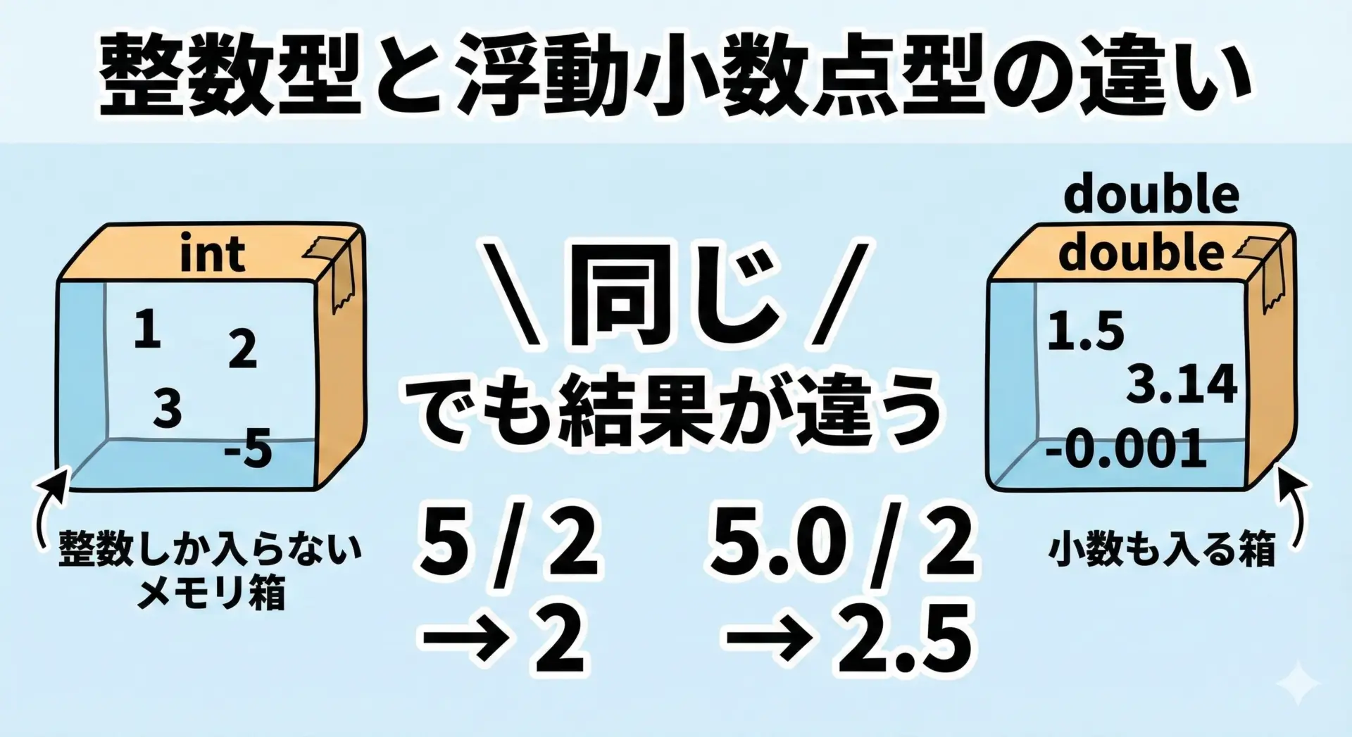ここで重要なのが、整数型と浮動小数点型の違いです。