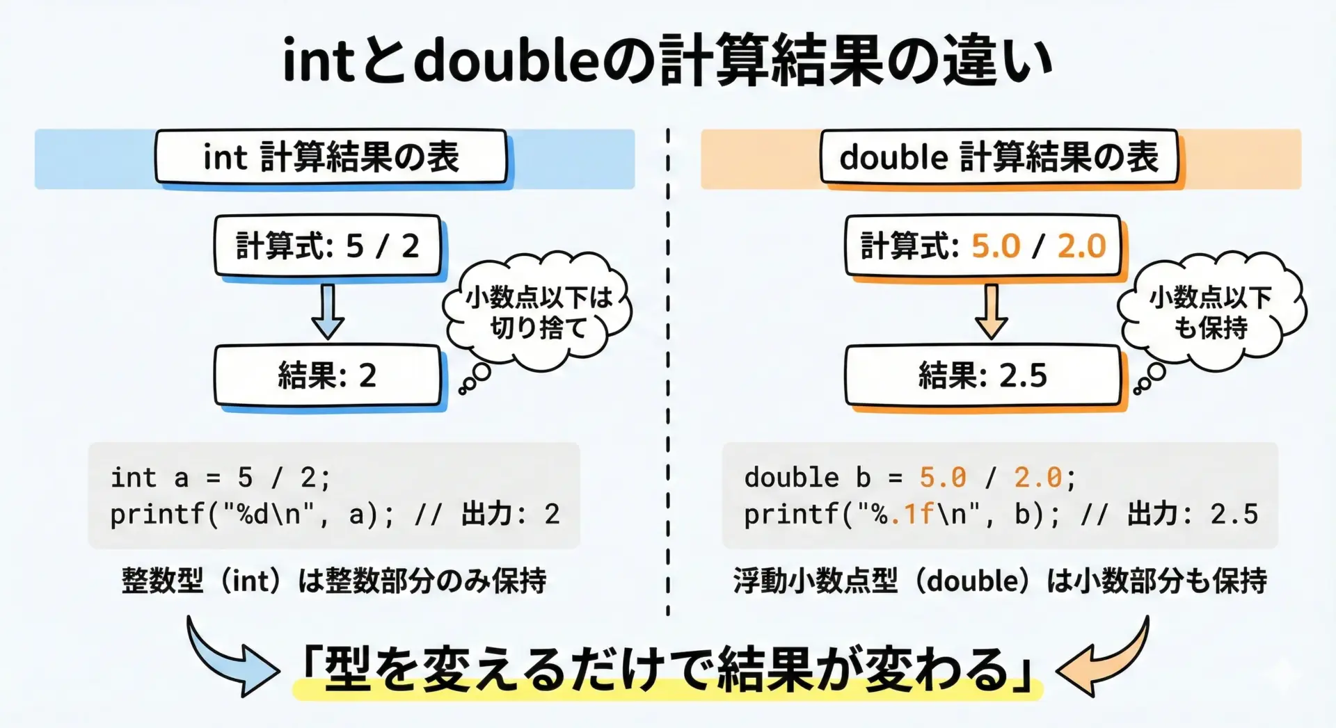 C言語では、同じ演算子でも「型」によって結果が変わることがあります。