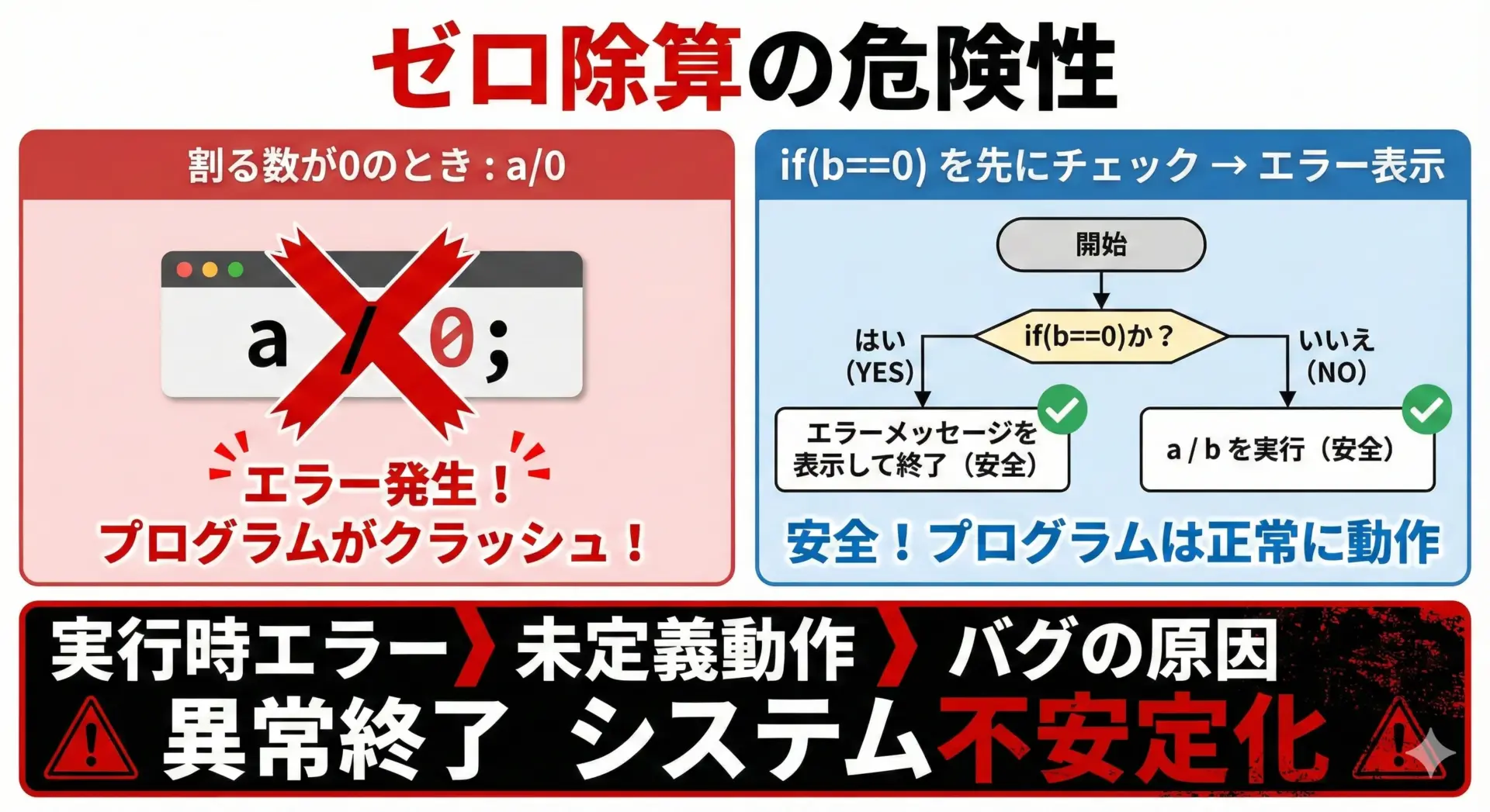 入力値で割り算を行うプログラムを書くときは、「割る数が0でないか」を必ずチェックするクセを付けておきましょう。