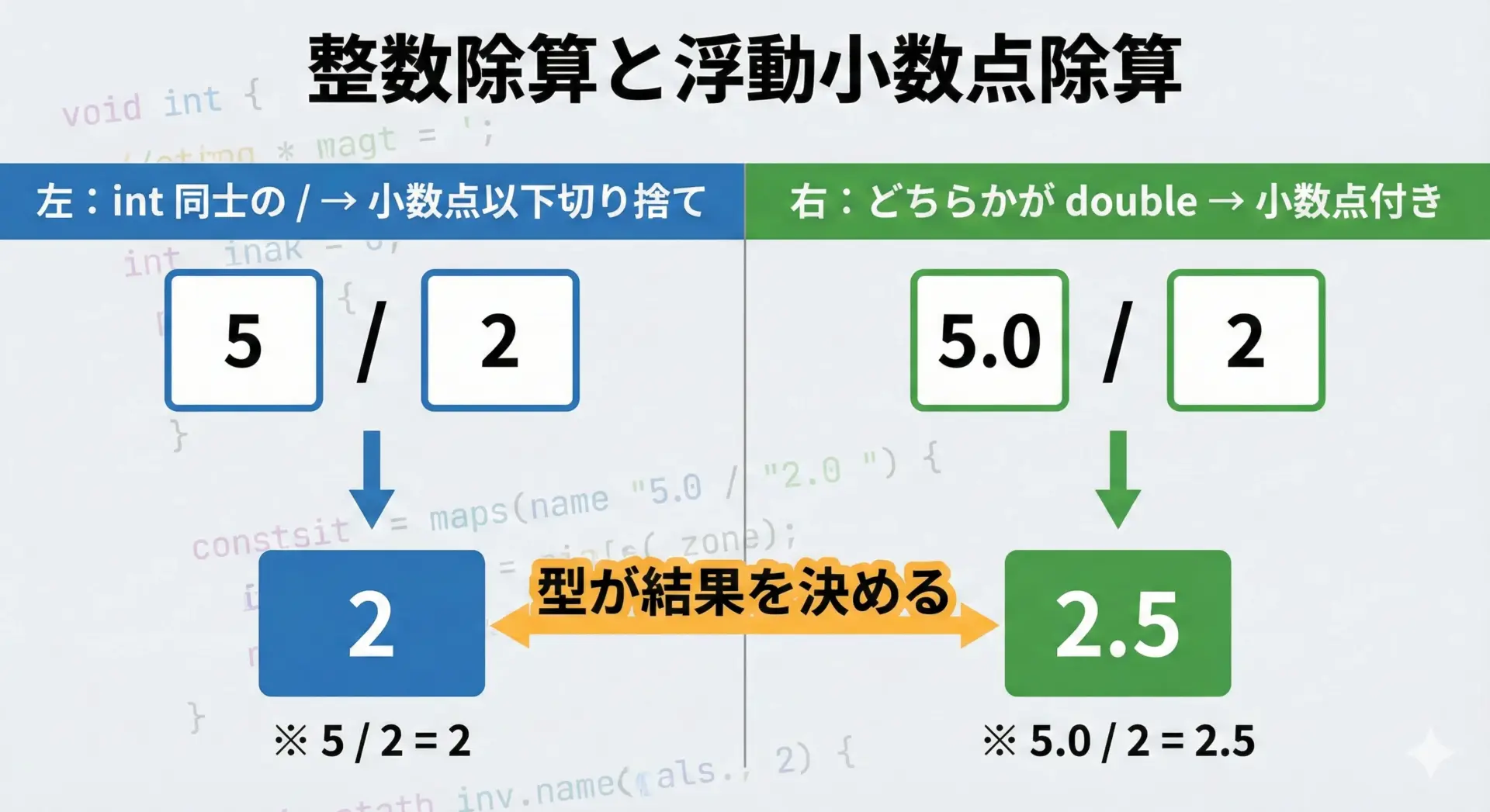 ここで特に重要なポイントは、%演算子は整数型にしか使えないことと、/演算子はオペランドの型によって「整数除算」か「小数点付き除算」かが変わることです。
