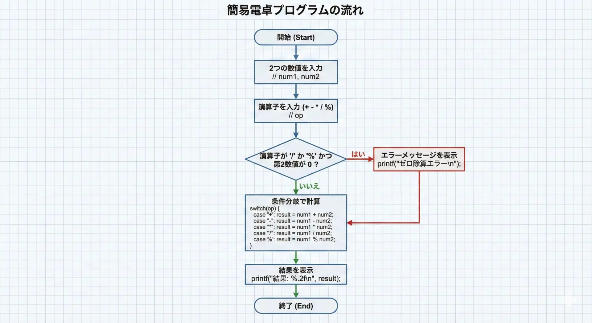 本記事では、C言語の四則演算について、基本的な演算子の使い方から、型の違い・オーバーフロー・ゼロ除算・計算誤差といった実務で重要な注意点まで、順を追って解説しました。