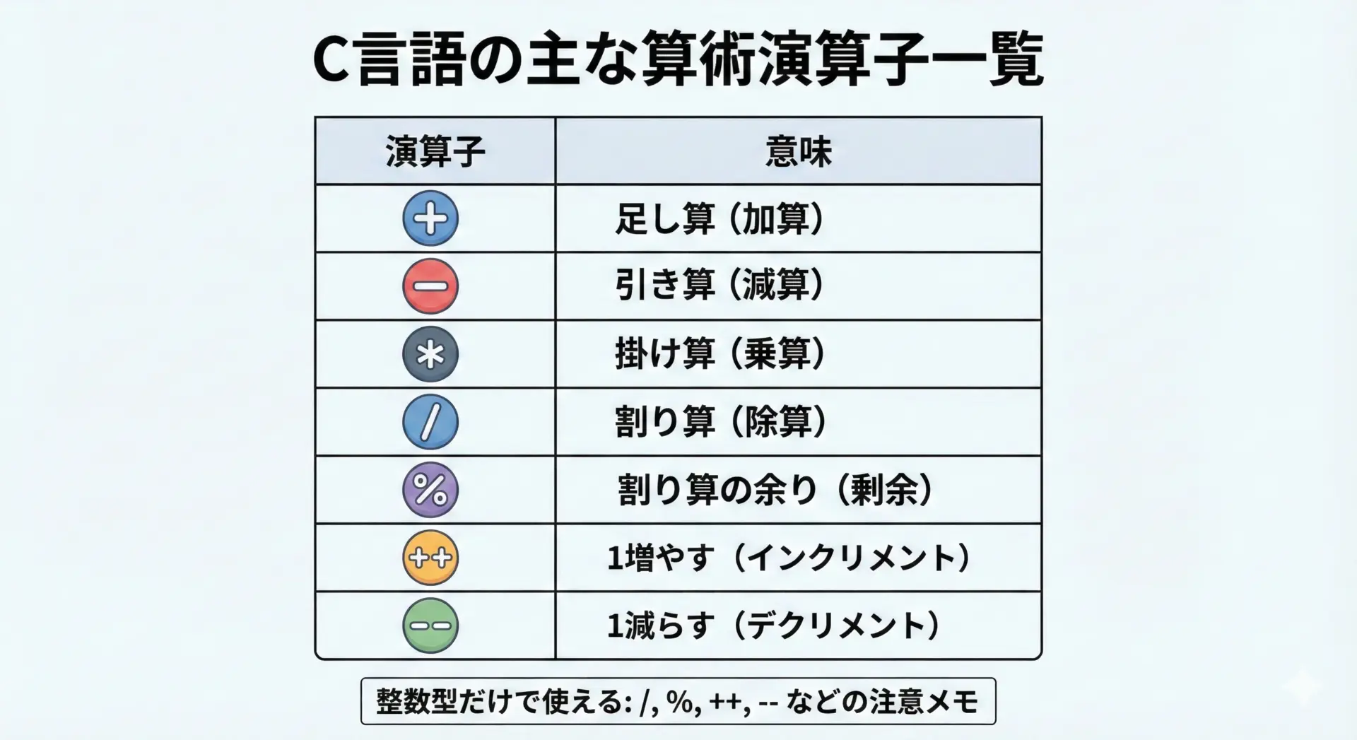 C言語でよく使う算術演算子を最初に一覧で整理します。