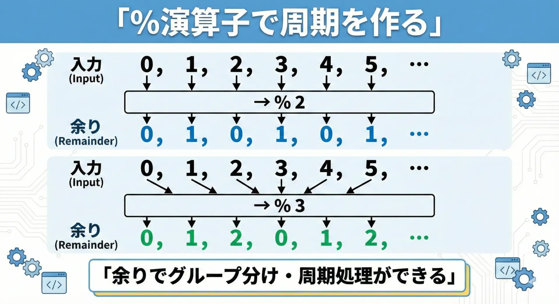 例えば、3回ごとに特別な処理を行いたいときは、i % 3を使うと簡単です。