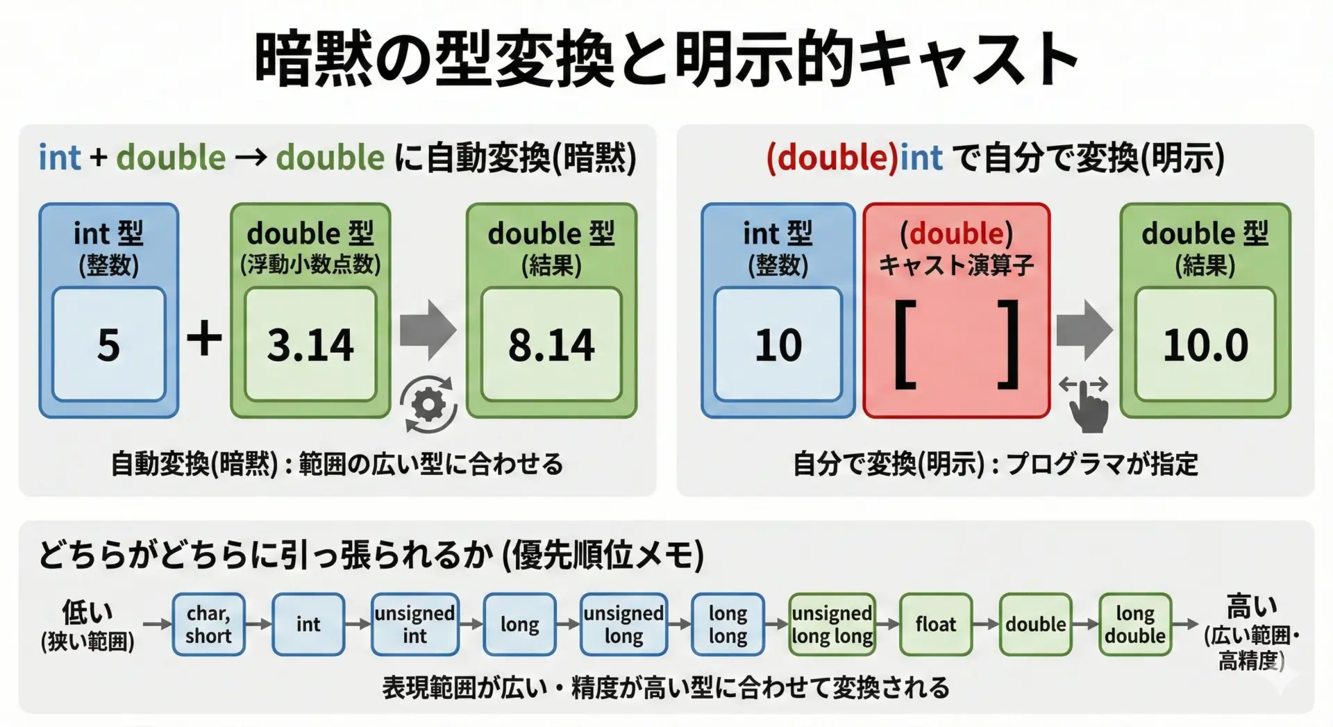 例えば、intとdoubleを足し算すると、intはdoubleに自動的に変換され、doubleとして計算されます。