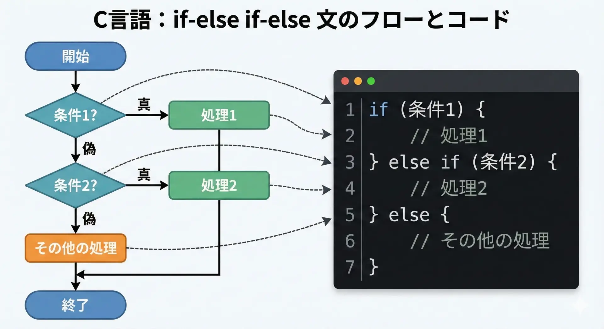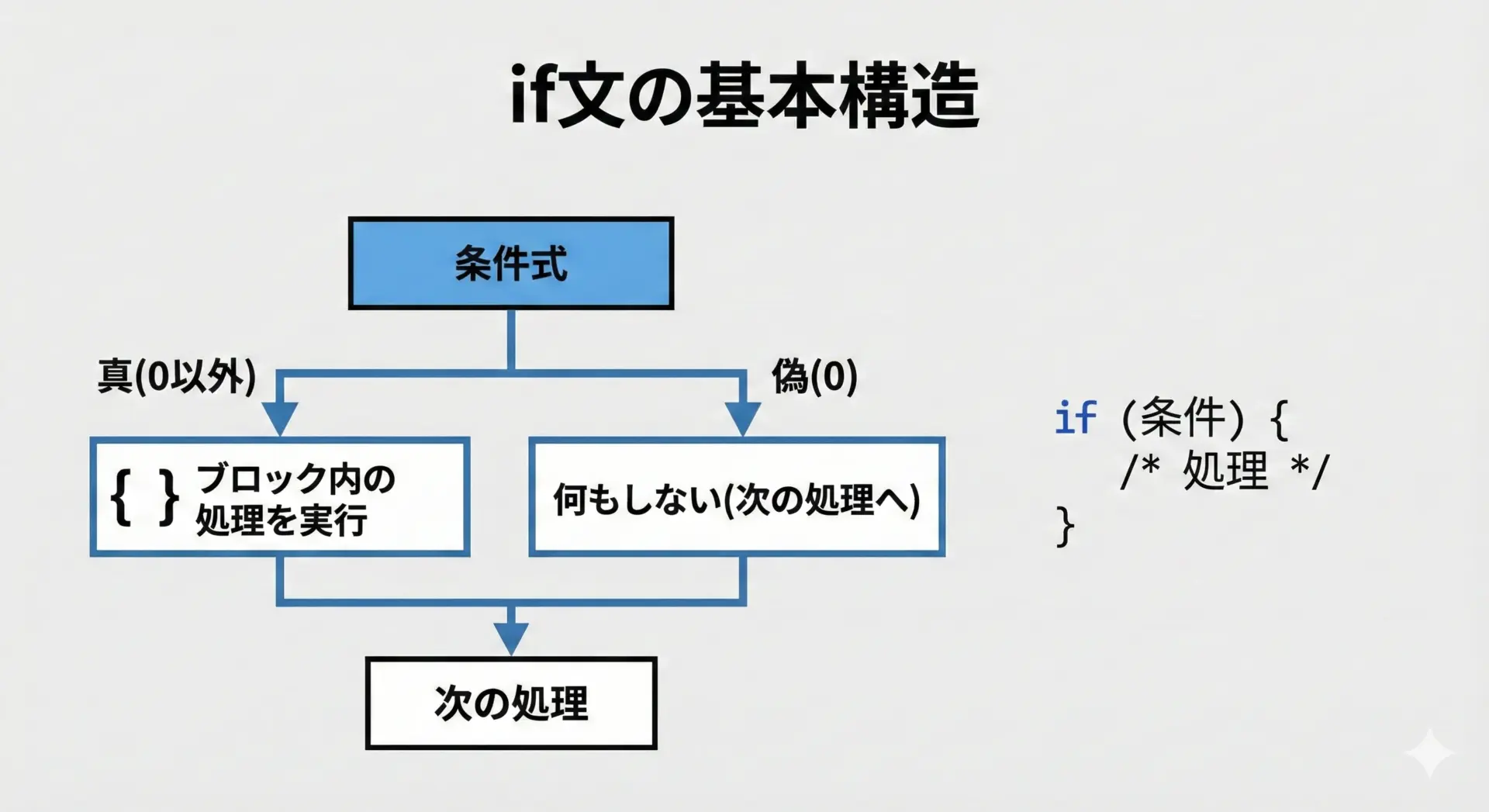 C言語のif文は、プログラムに「条件によって処理を分ける」という考え方を教えてくれる、とても重要な構文です。