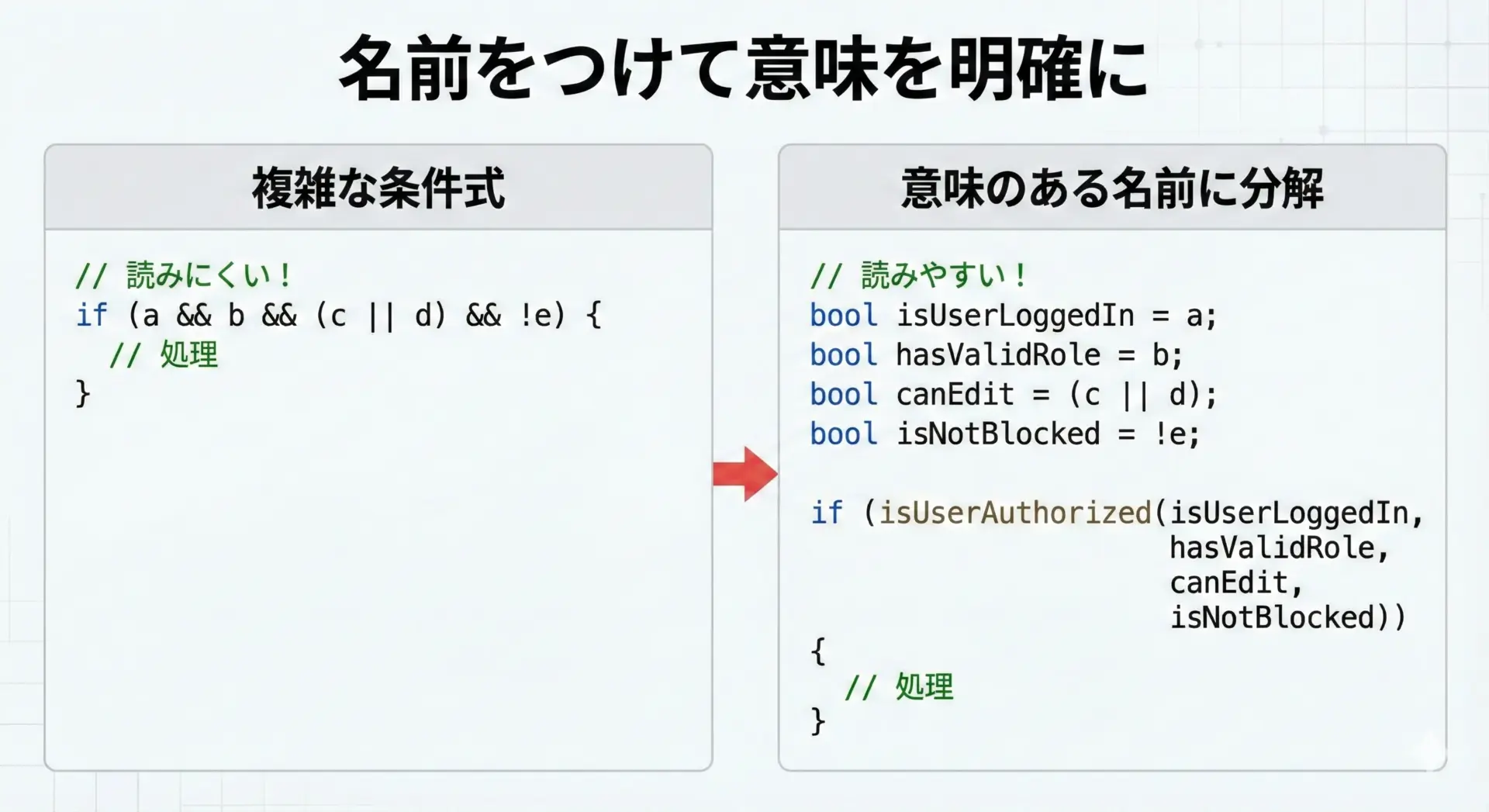 このように中間の条件に名前をつけることで、if文が「日本語の文章」に近い読みやすさになります。
