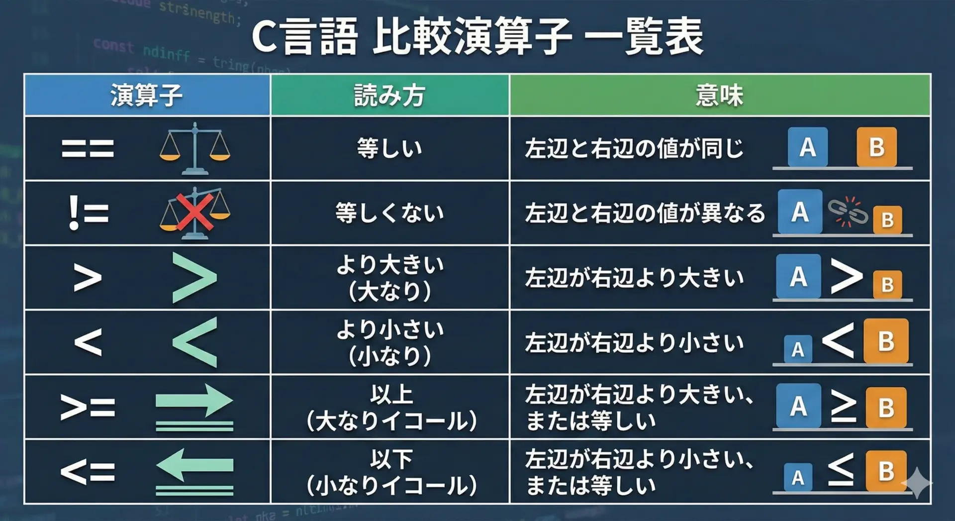 | ! | 否定(NOT) | 条件が真なら偽、偽なら真に反転する | !(x == 0) は x != 0 と同じ意味 |