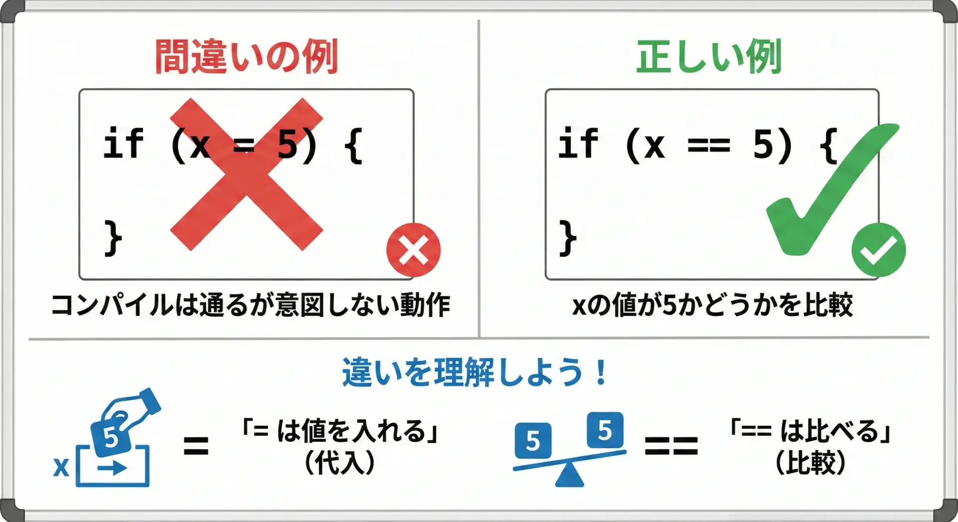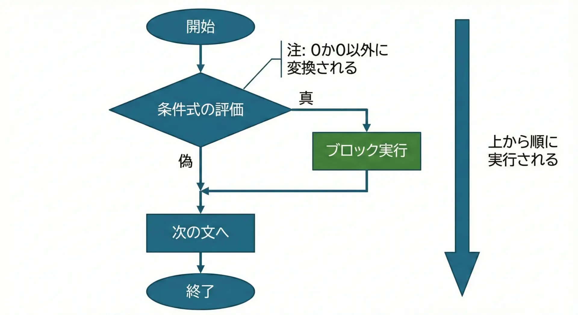 特に「0は偽、0以外は真」「==と=の違い」「論理演算子とビット演算子の区別」は、if文を正しく使ううえで非常に重要なポイントです。
