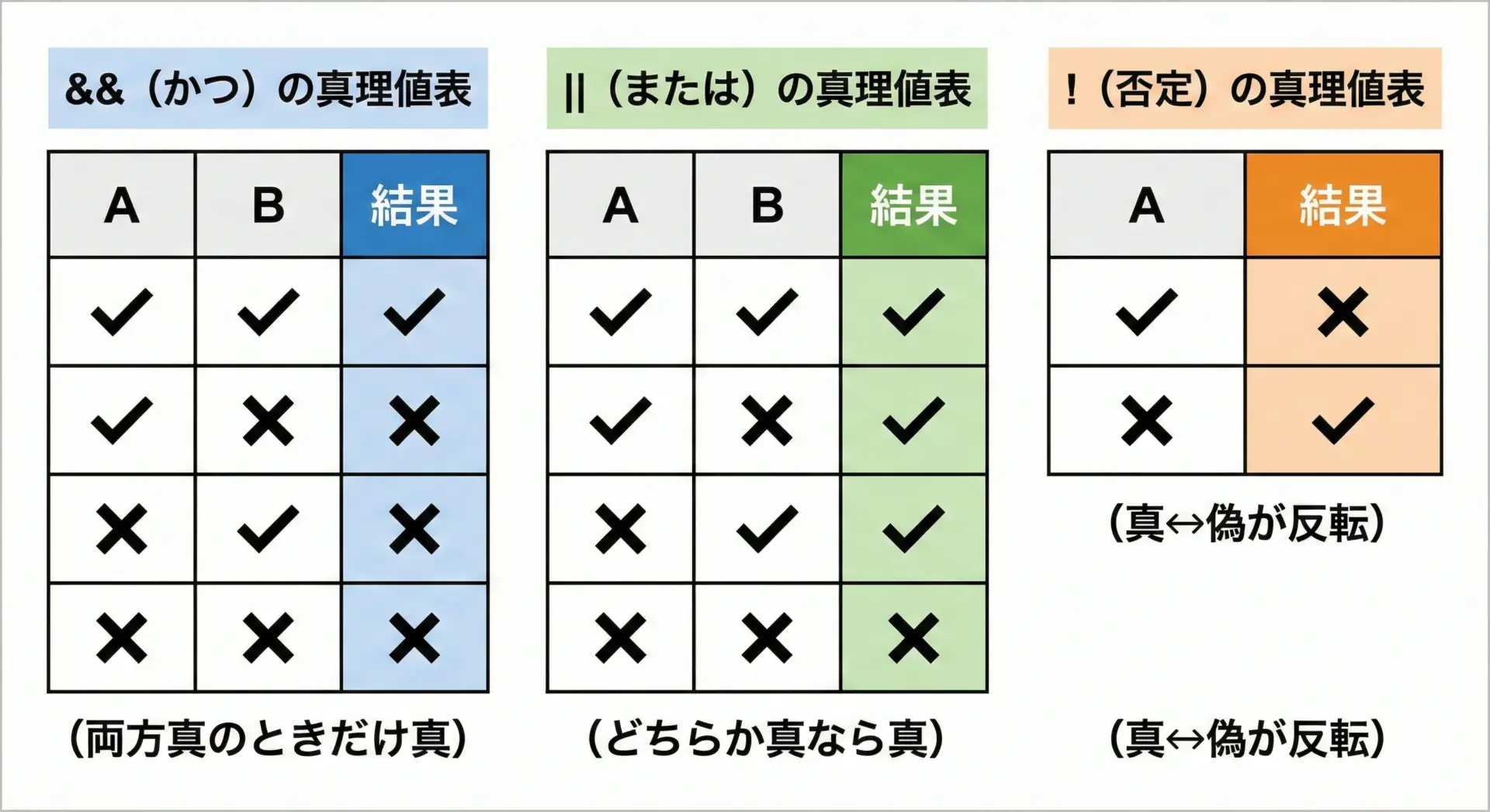 | 論理演算子 | &&, || | 真偽値(条件) | ifの条件を組み合わせる |