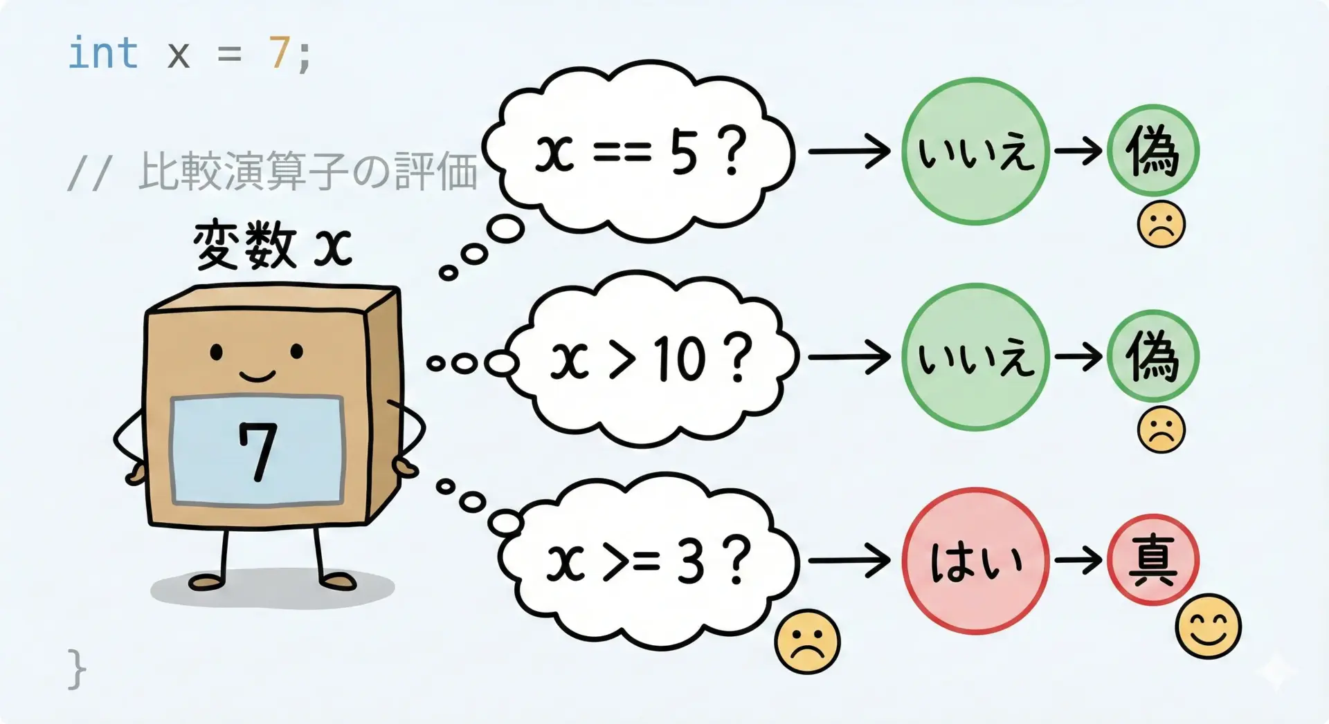 このように、比較演算子の結果は「真か偽」になり、そのままif文の条件式として使えると理解してください。
