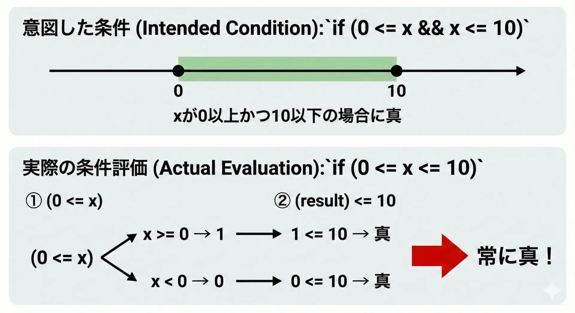 ここで重要なのは、条件式の評価結果が「0か0以外か」で真偽が決まるという点です。