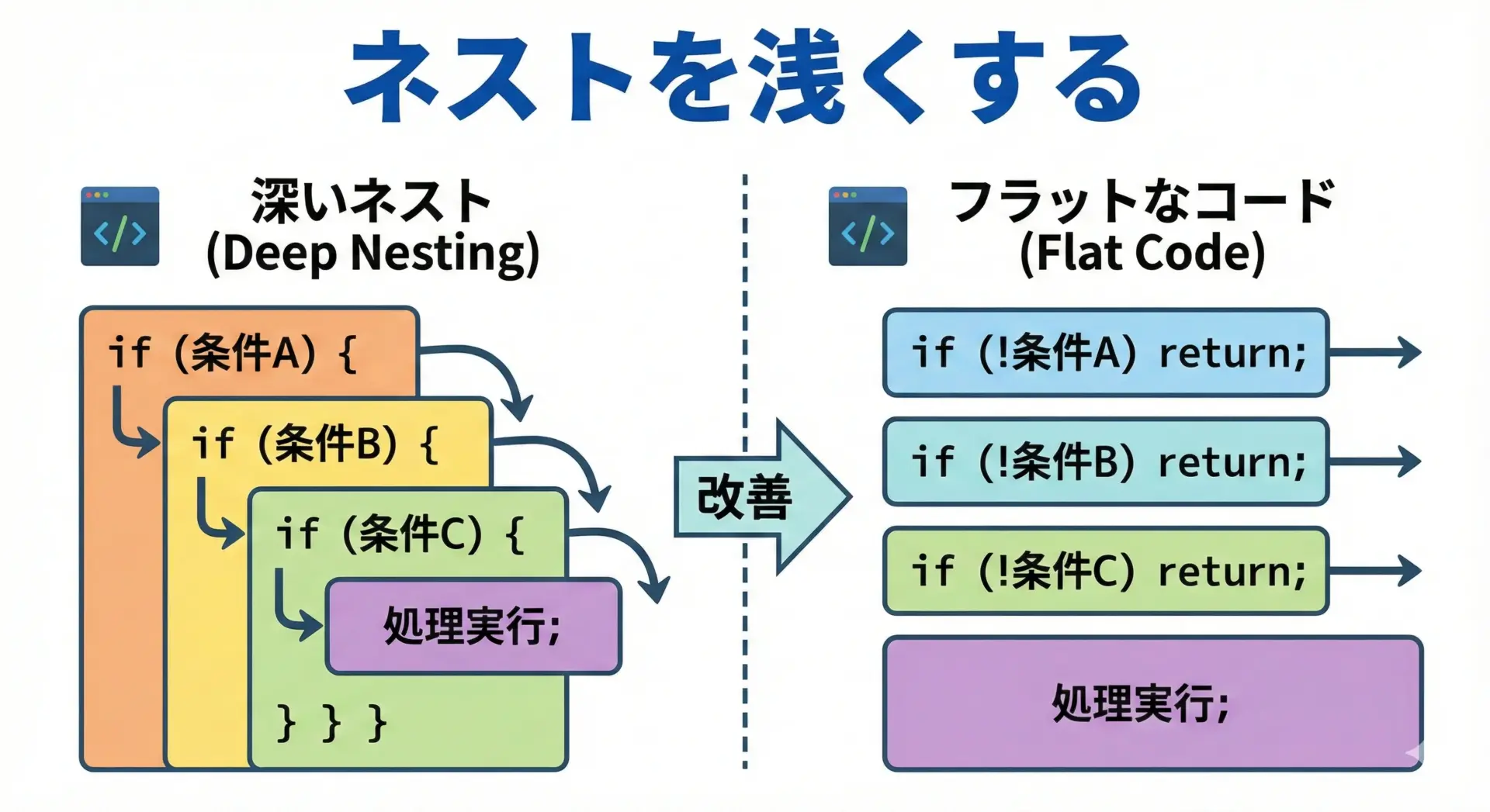 ネストが深くなると、コードが読みにくく、バグも混入しやすくなります。