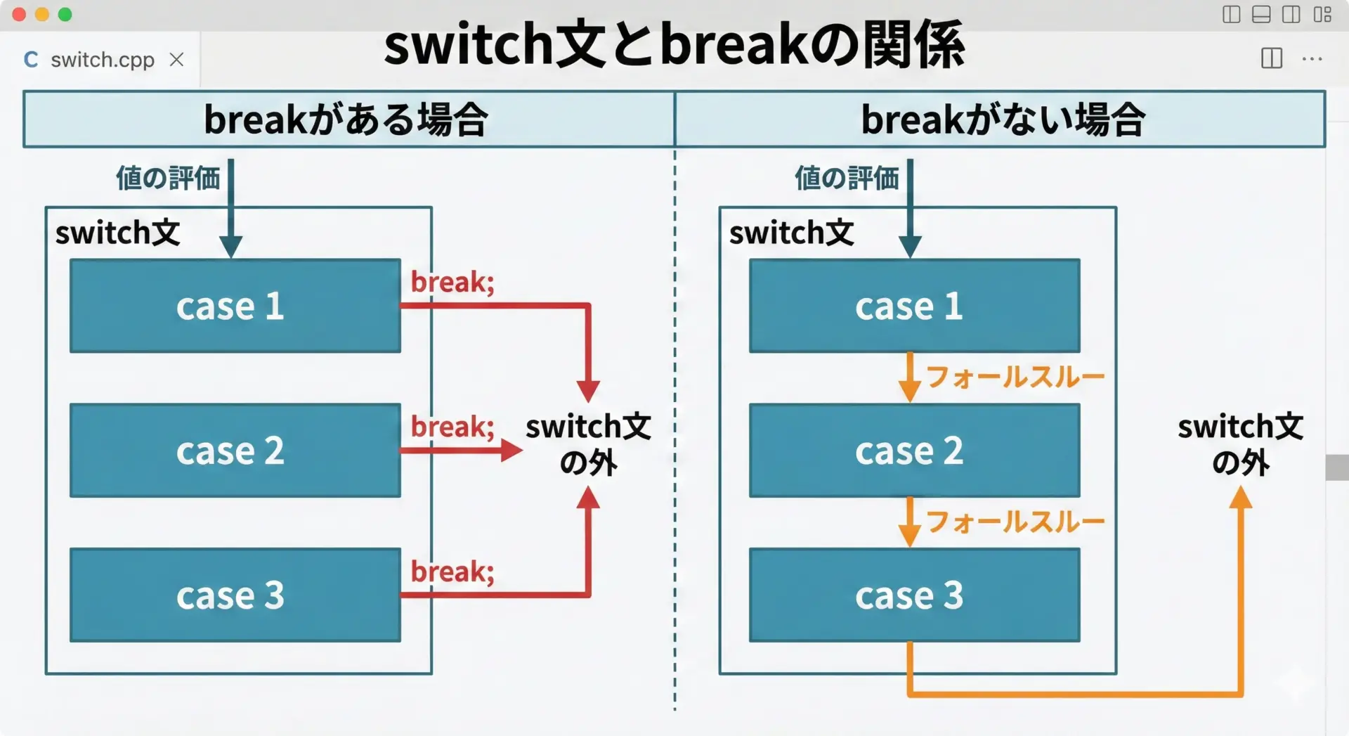 このように、switch文におけるbreakは「そのcaseの処理を終えたらswitch全体から抜ける」ためのものです。