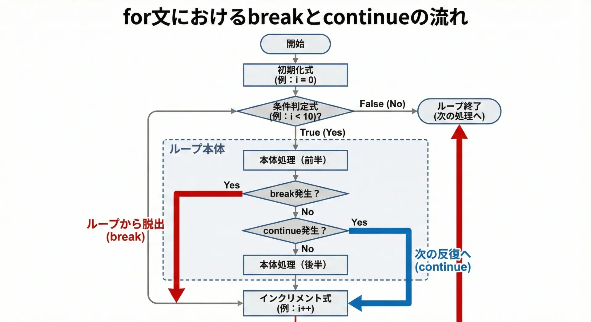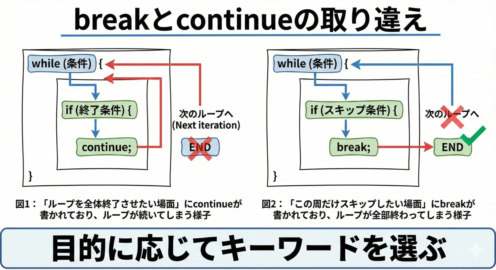 目的が「ループ全体を終わらせたいのか」「この1回分だけ飛ばしたいのか」を常に意識しながら書けば、breakとcontinueを安全かつ効果的に使いこなせるようになります。