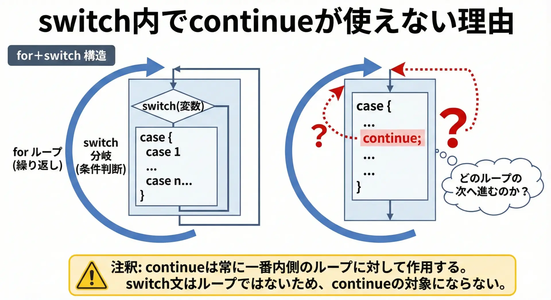 ただし、switchがループの中に書かれている場合、switchの中にあるcontinueは「そのループに対するcontinue」として解釈されます。