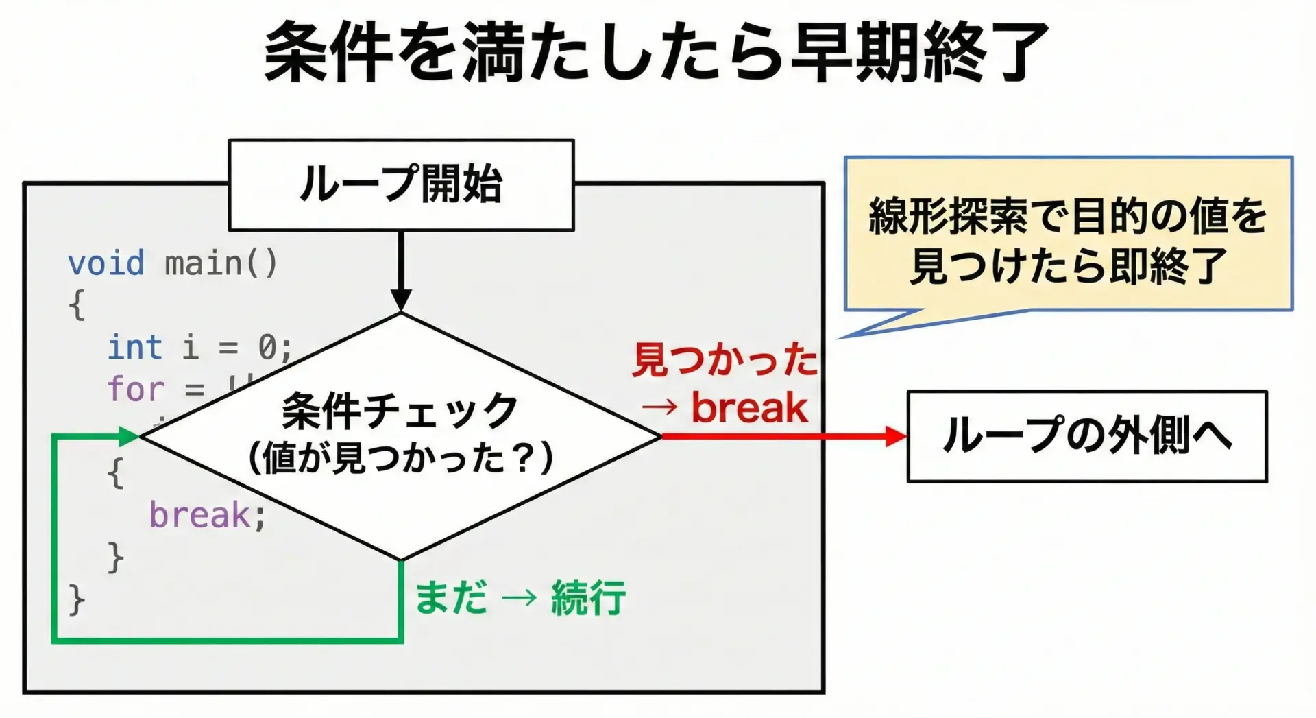 C言語では、無限ループとbreakを組み合わせて柔軟な繰り返し処理を書くことがよくあります。