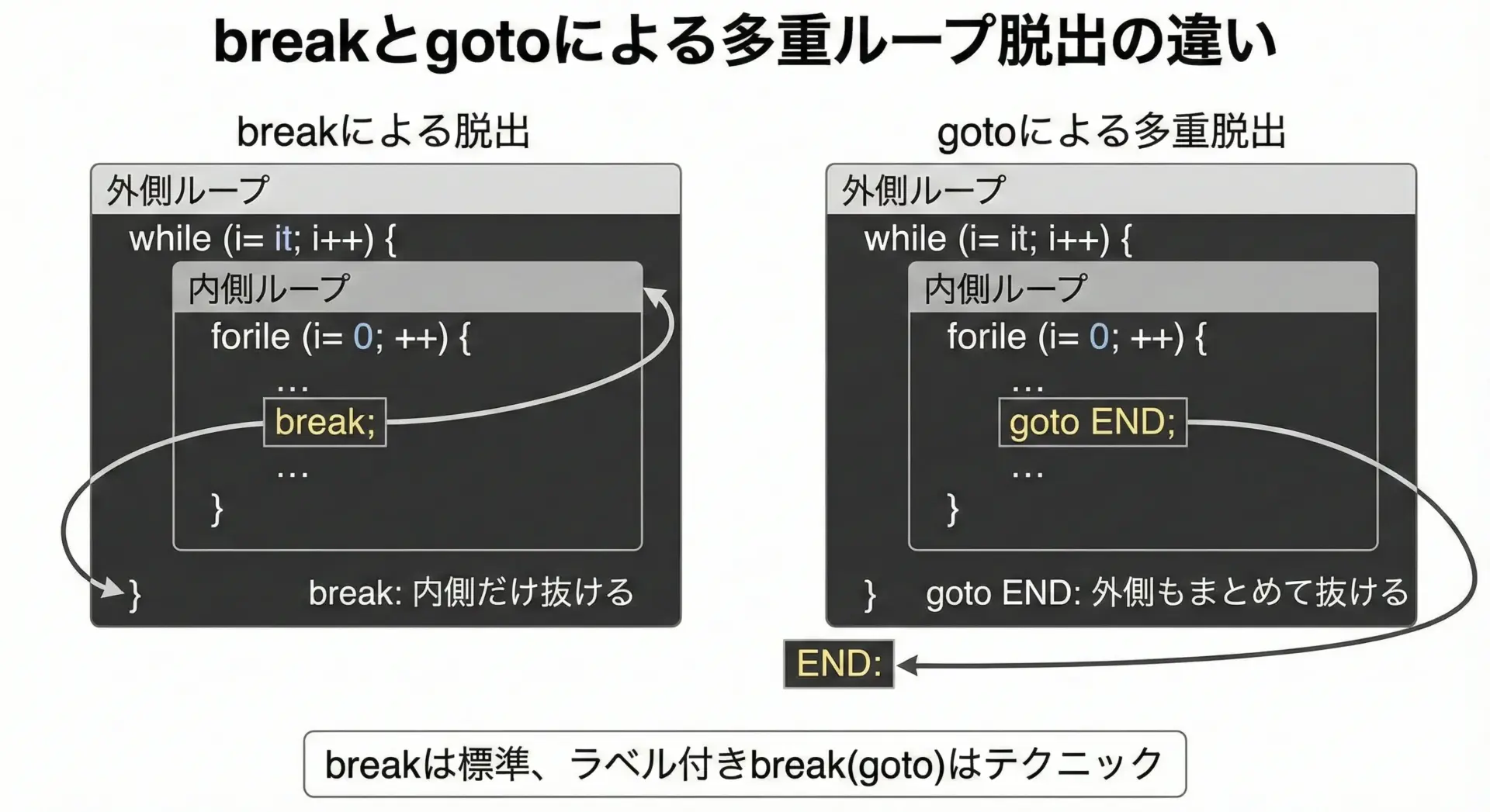 C標準自体には「ラベル付きbreak」はありませんが、「外側のループまで一気に抜けたい」ときにgotoで似たような動作を実現することがあります。