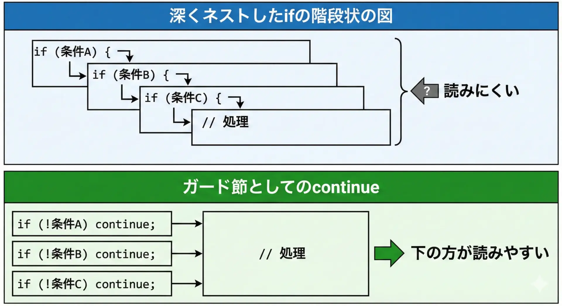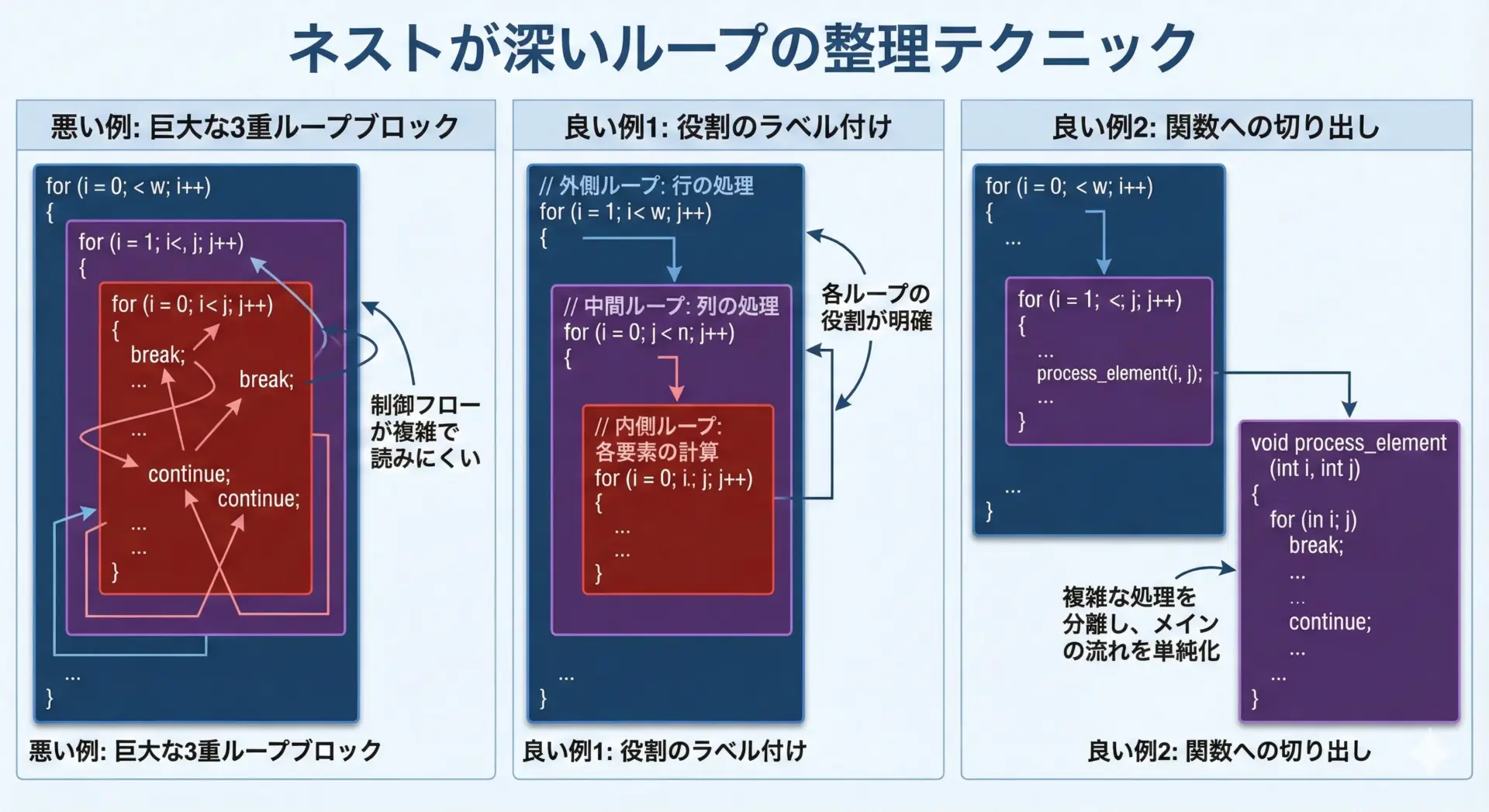 このように、ネストが深くなるほど、break/continueを減らし、処理を分割して見通しを良くすることが大切です。