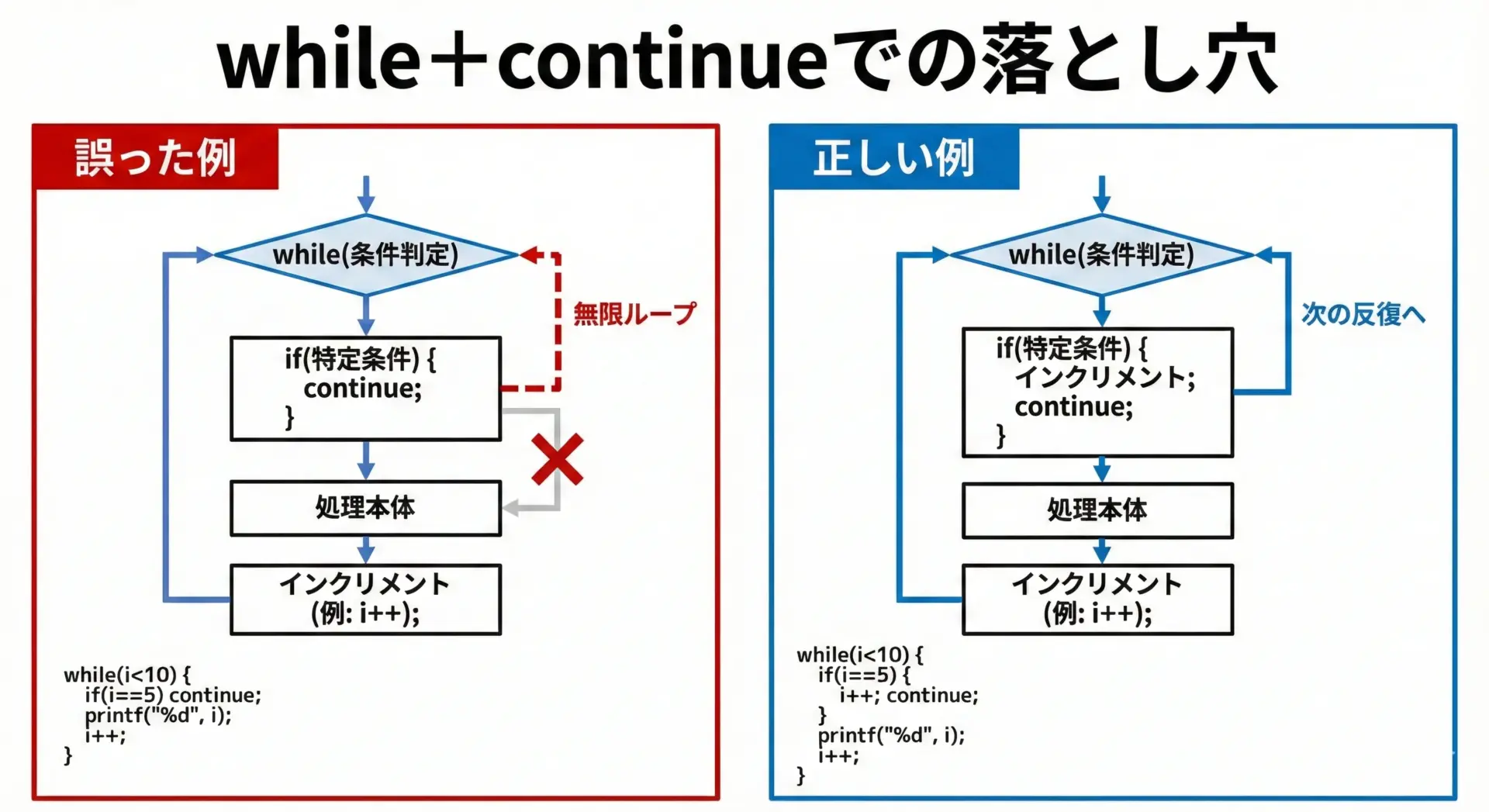 特に、switch文でのbreak忘れや、while文+continueでのインクリメント忘れ、多重ループでの対象ループの勘違いなどは典型的な落とし穴です。