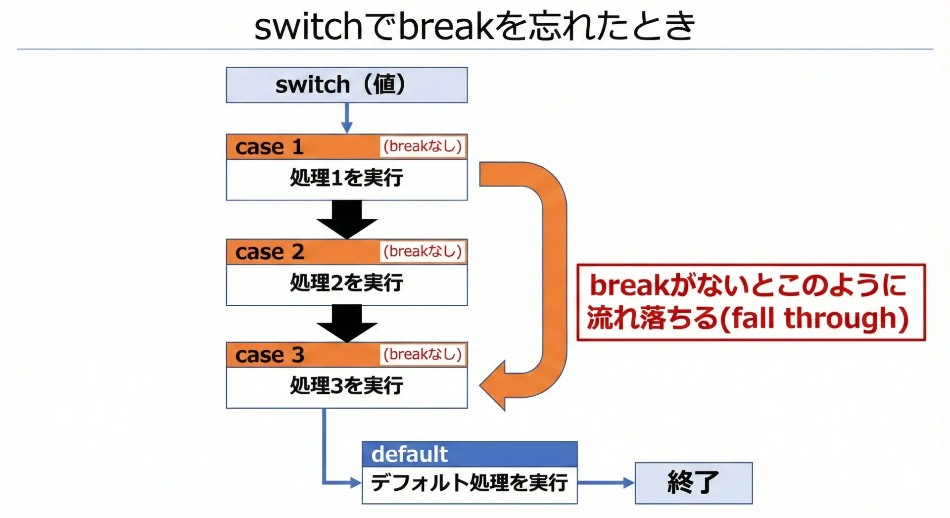 breakを書き忘れると、意図せず次のcaseに処理が「落ちて」進んでしまうので注意が必要です。