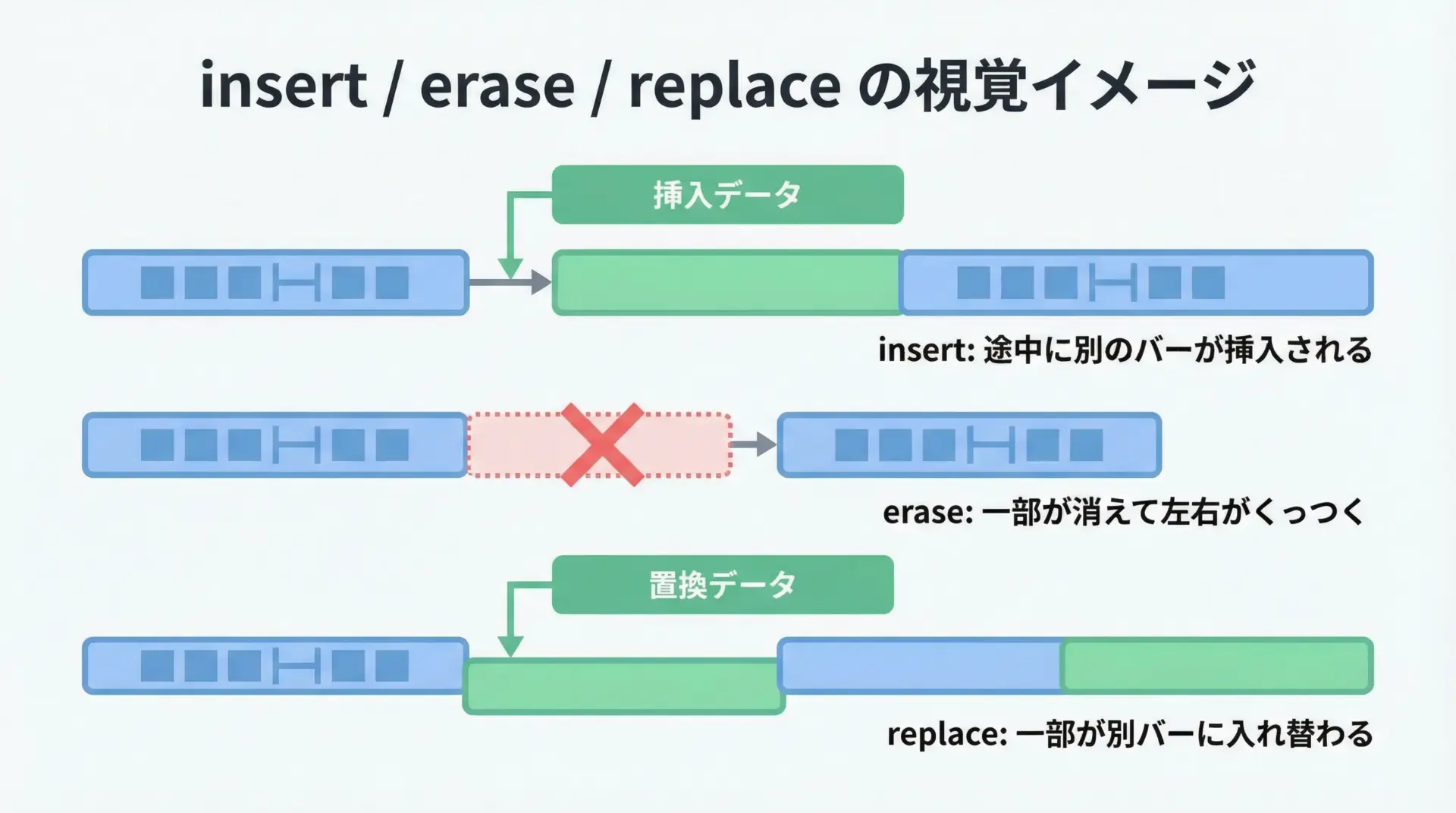 insert・erase・replaceはいずれも「位置と長さ」を指定するインターフェースで、配列操作のような感覚で扱えます。