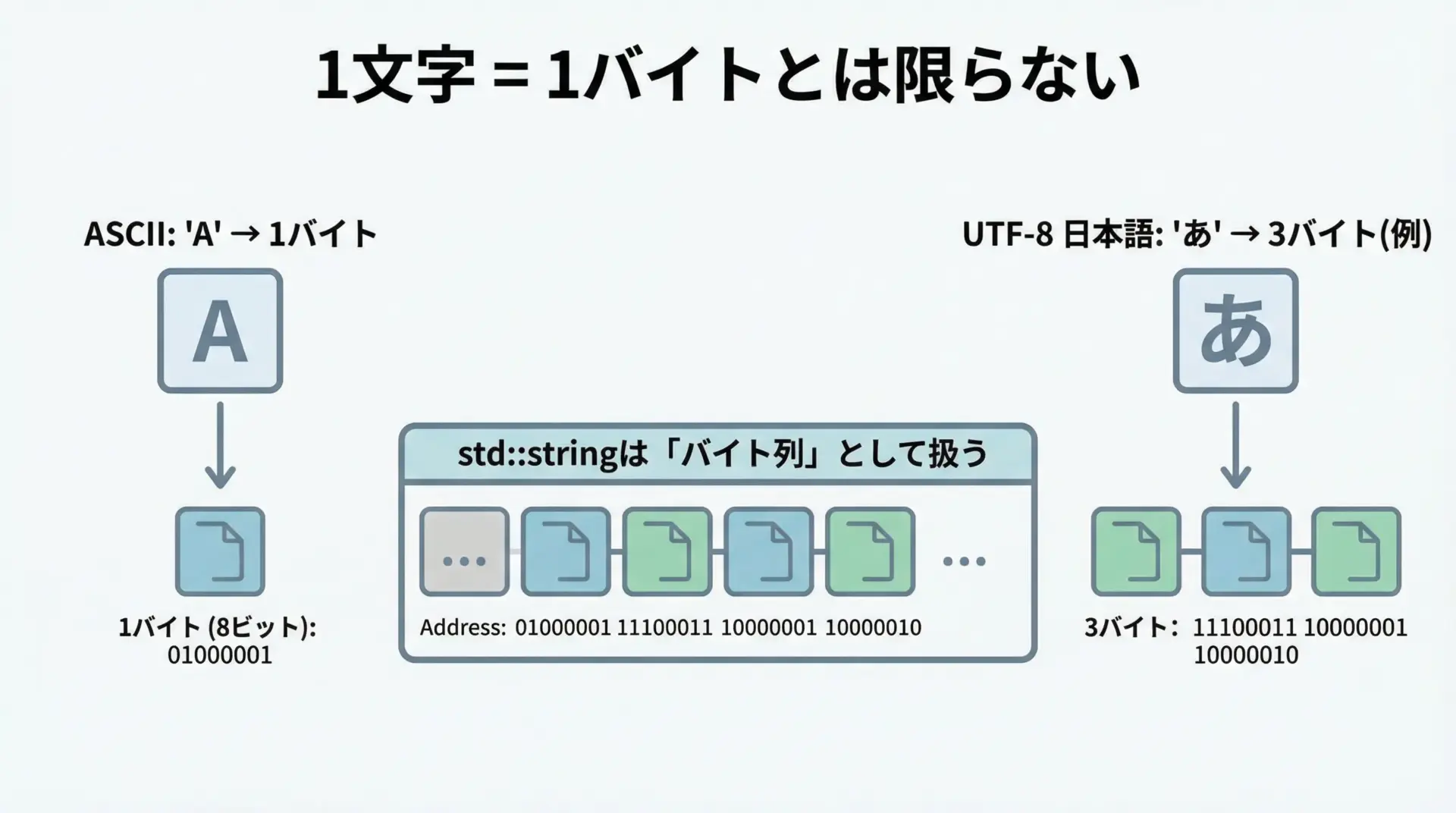std::string「文字の並び」ではなく「バイト列の並び」として実装されていることが多く、特にUTF-8環境では日本語1文字が複数バイトになることに注意が必要です。