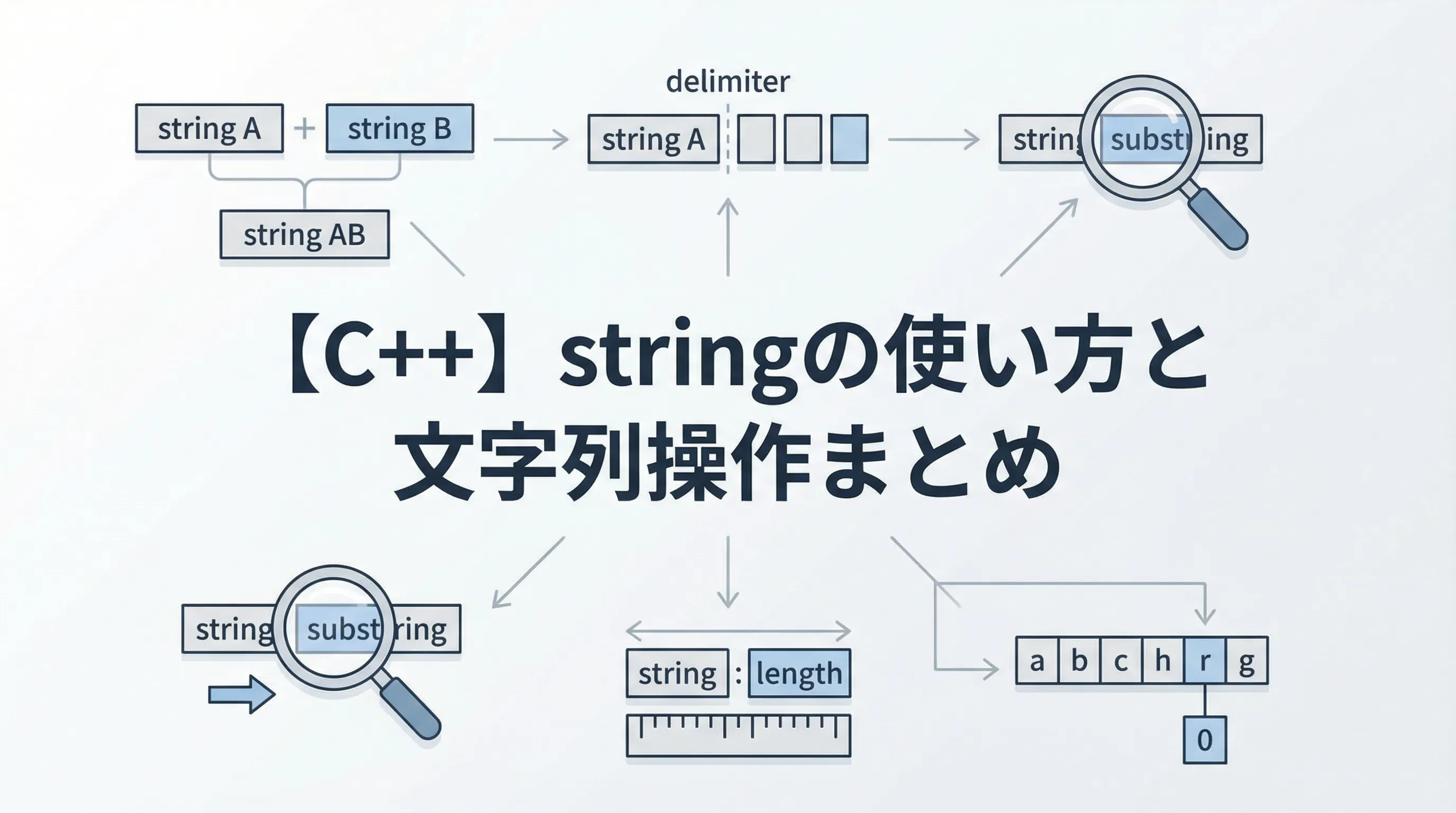 本記事では、宣言と初期化、代入・連結、長さや空判定、文字単位アクセス、substr・find・insert・erase・replaceといった基本操作、標準入出力との連携や数値変換、c_strによるC文字列との橋渡しなどを一通り紹介しました。