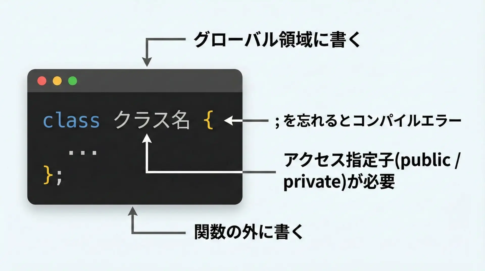 C++でクラスを定義する基本形は次のようになります。