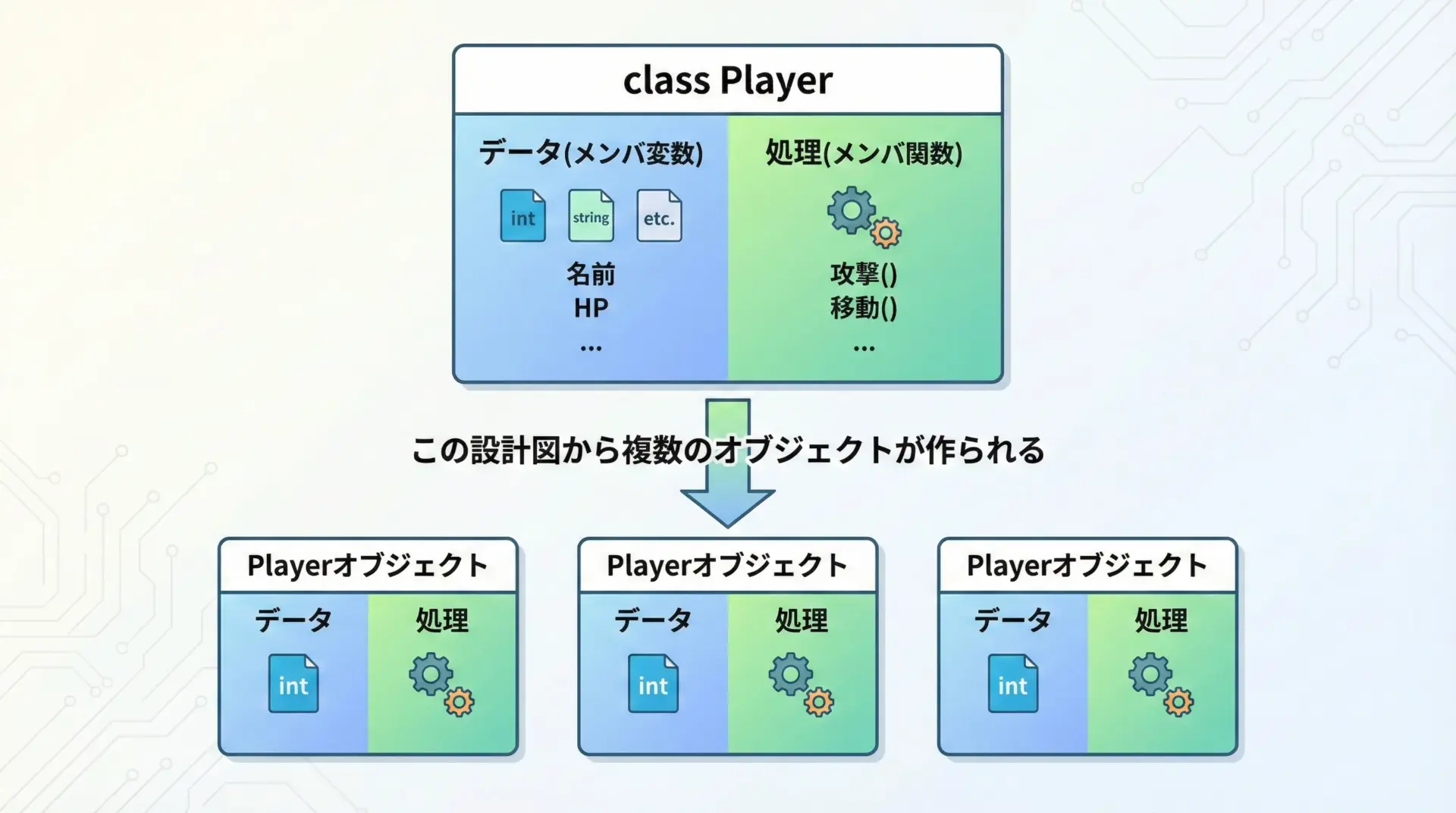 この「プレイヤーの設計図」がクラスであり、その設計図から実体として作られるものがオブジェクトです。