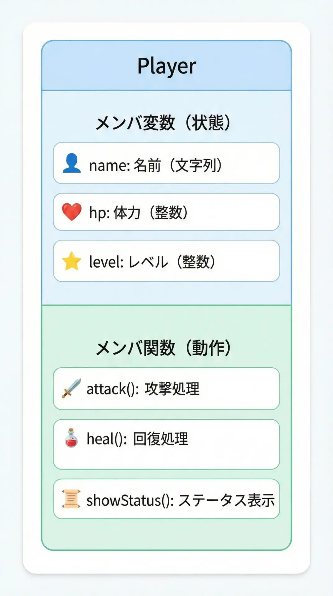 たとえばゲームのプレイヤーを表すとき、次のような情報と処理をまとめて持てると便利です。