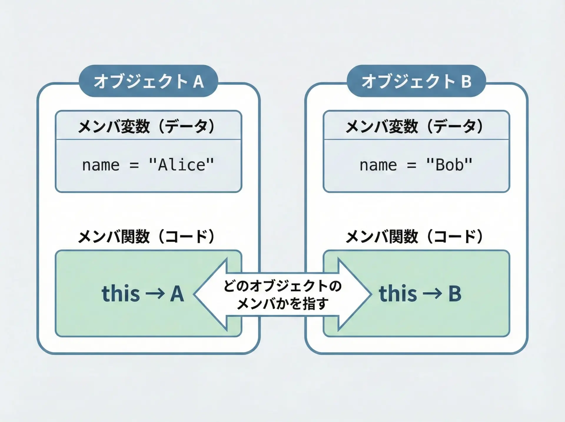- メンバ関数(メソッド) … そのデータを扱う関数