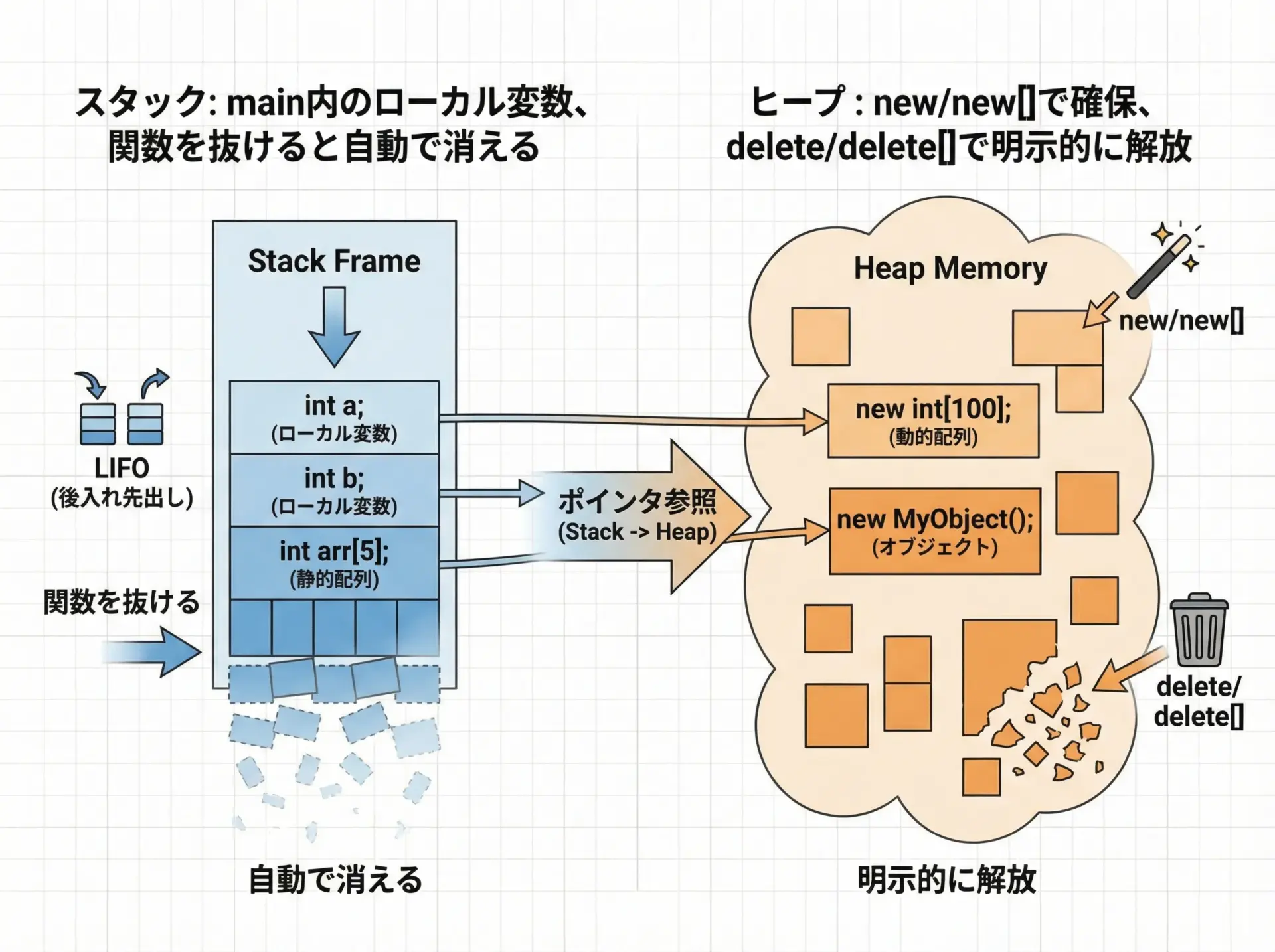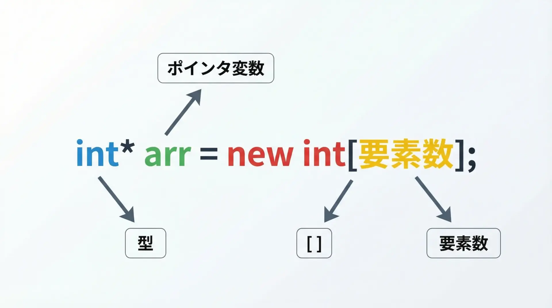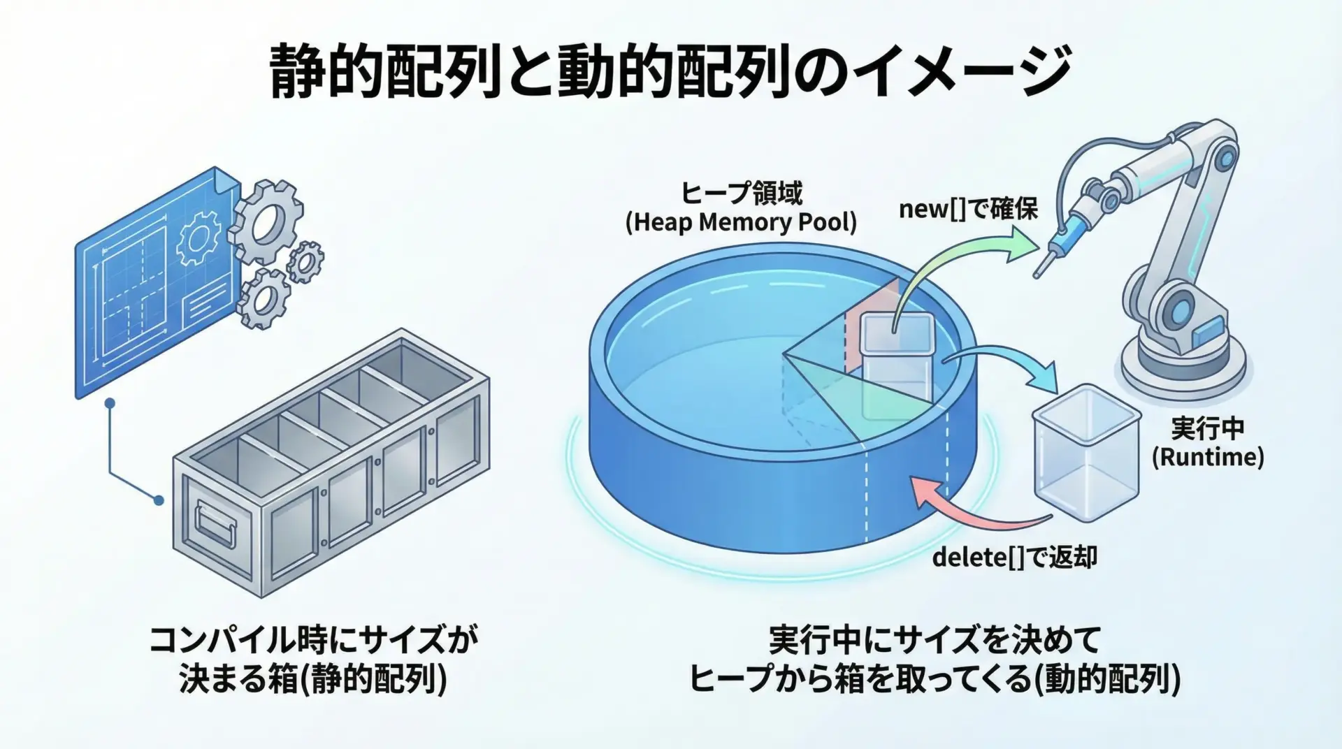 本記事では、固定配列との違いから、new[]/delete[]の正しい書き方、陥りやすいミス、そして現代C++でのより安全な代替手段まで、図解とコード例を交えながら詳しく解説します。