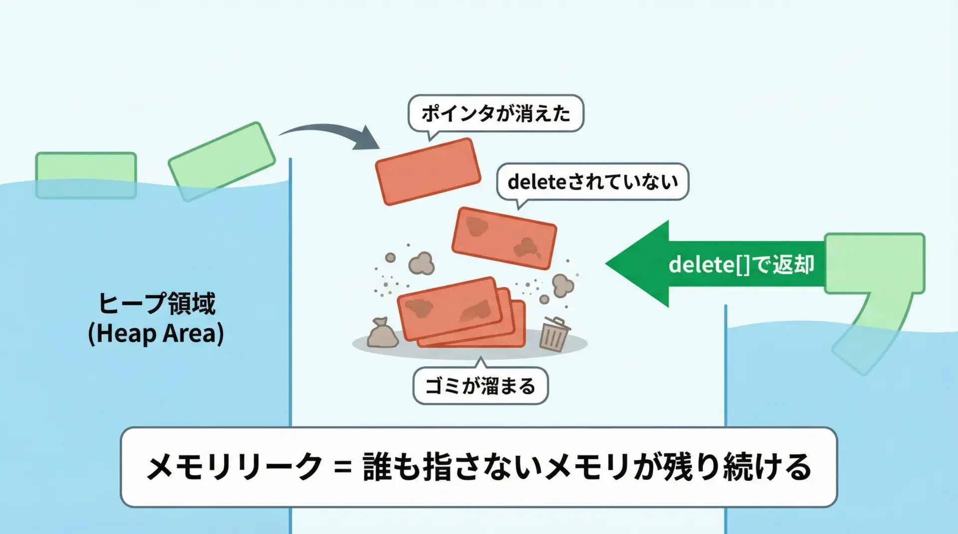 もしdelete[]を書き忘れると、解放されないメモリが積み重なり、メモリリークという不具合を引き起こします。