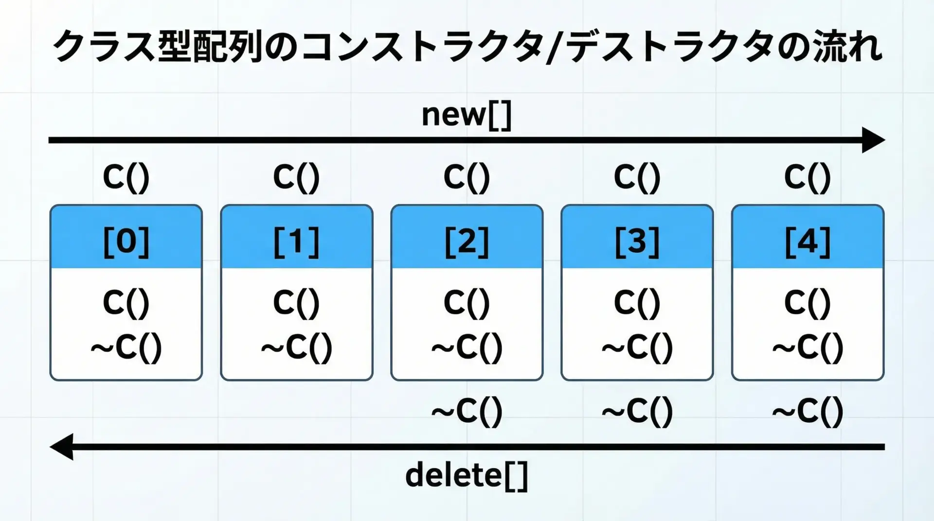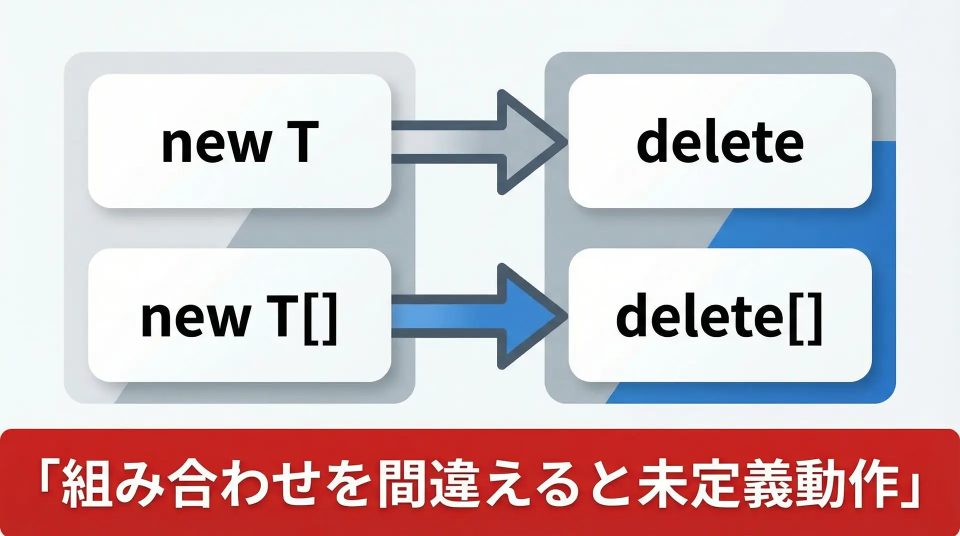 このように、クラス型では特に、new[]とdelete[]の組み合わせを間違えるとデストラクタが正しく呼ばれず、リソースリークを招くため注意が必要です。