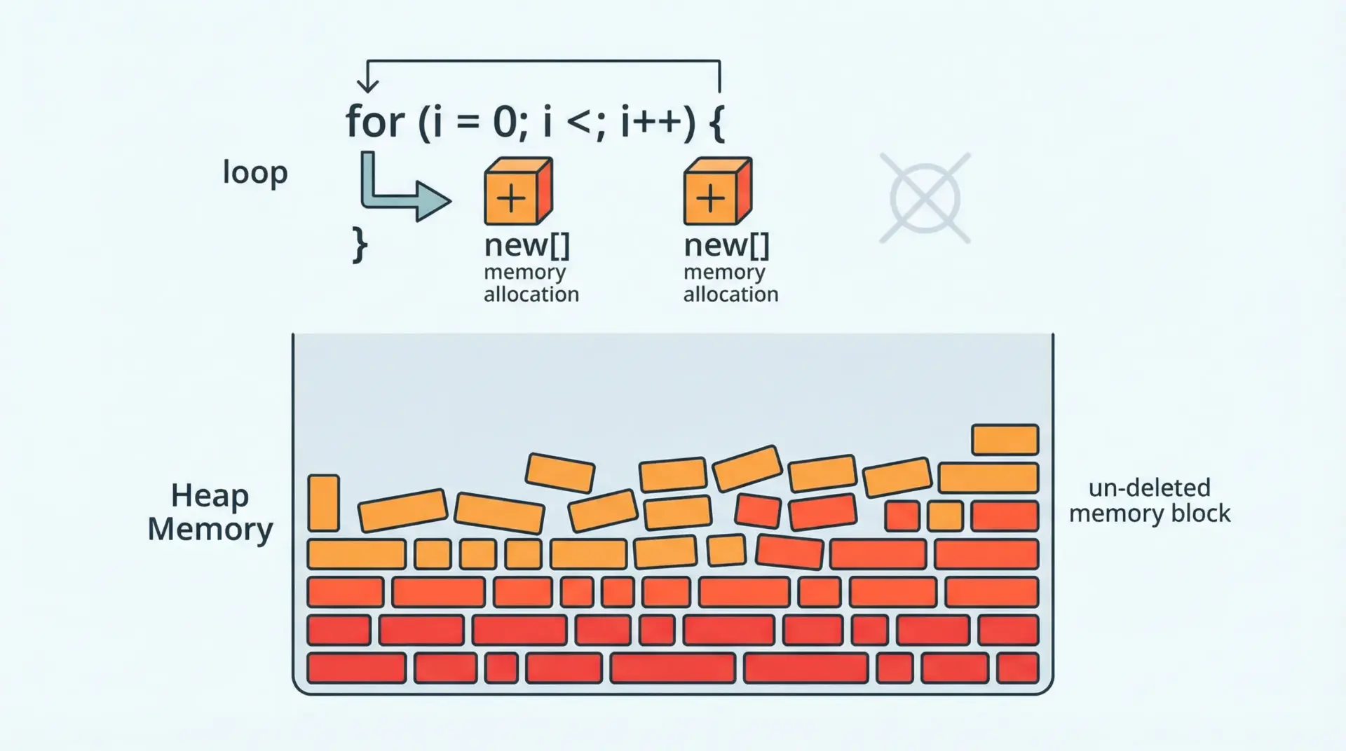 この関数が何度も呼ばれると、そのたびにヒープにメモリが確保され、解放されないまま溜まっていきます。