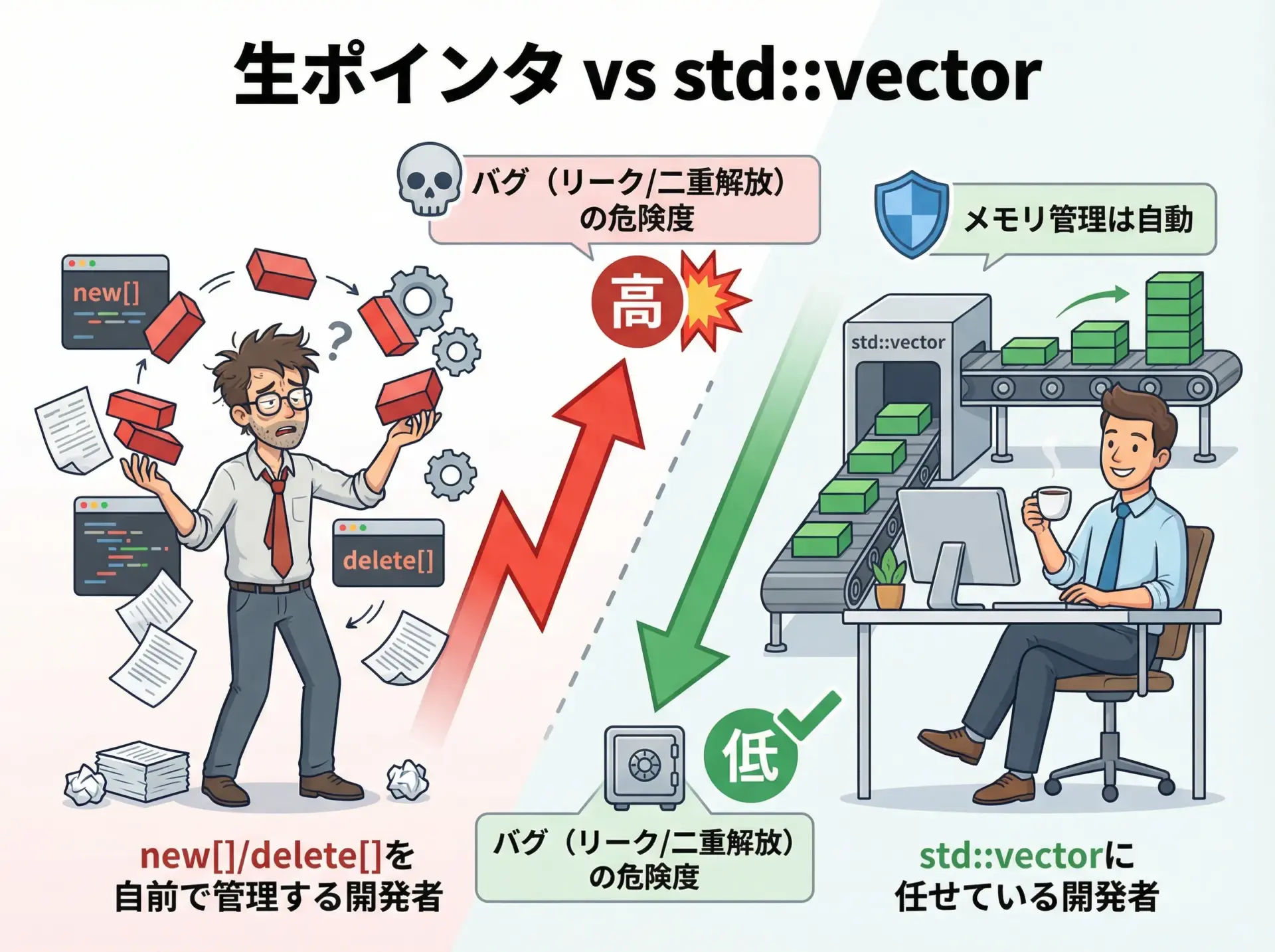 一方、現代C++ではstd::vectorなどのライブラリコンテナで動的配列を扱うのが標準的になっており、new[]/delete[]の直接利用は必要最小限にとどめるのが安全です。