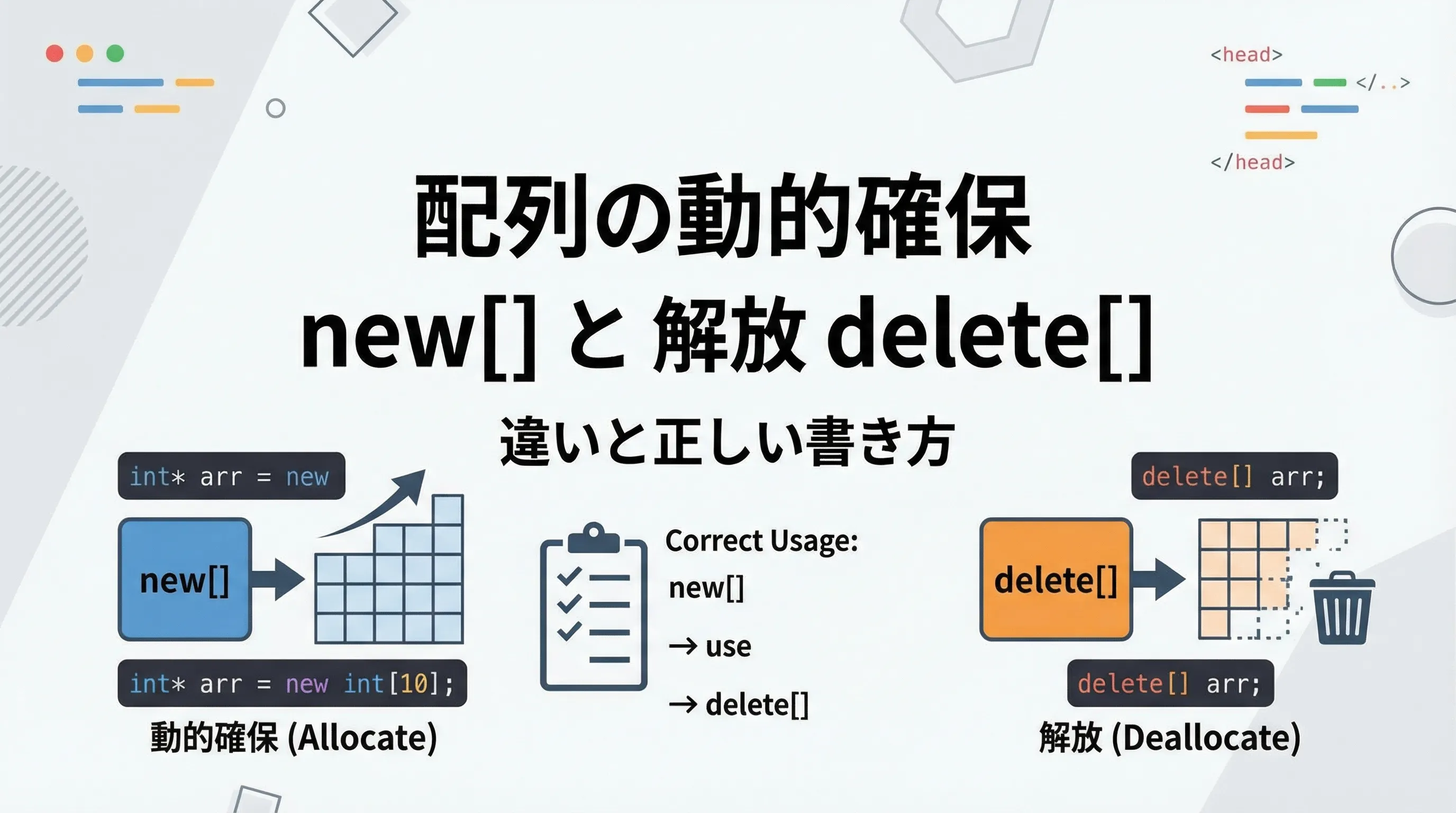 本記事では、固定配列との違いから、new[]/delete[]の正しい書き方、陥りやすいミス、そして現代C++でのより安全な代替手段まで、図解とコード例を交えながら詳しく解説します。