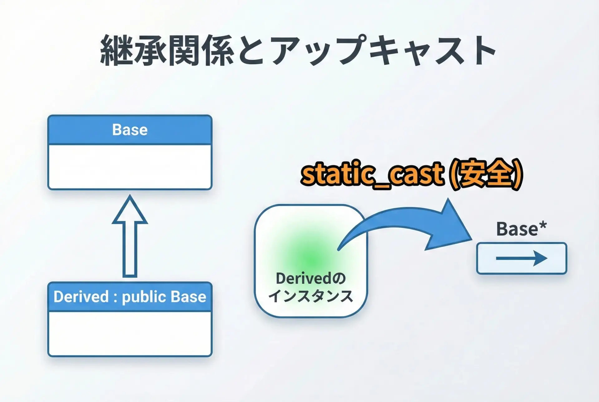 アップキャストは暗黙変換でも行えますが、あえてstatic_castを使うことで「ここで意図的に基底クラスとして扱う」ことを明示できます。