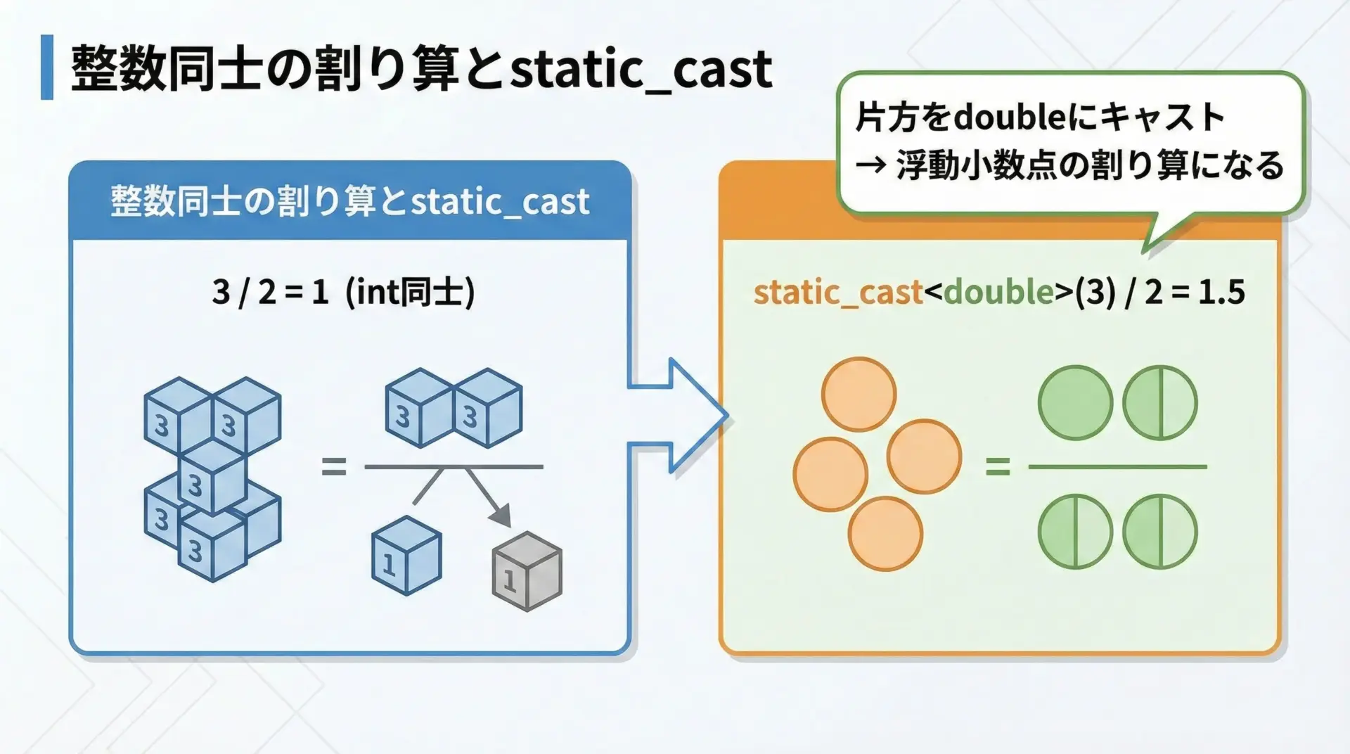 例えば、割り算の結果を浮動小数点で得たい場合に、static_castで明示的にdoubleに変換します。