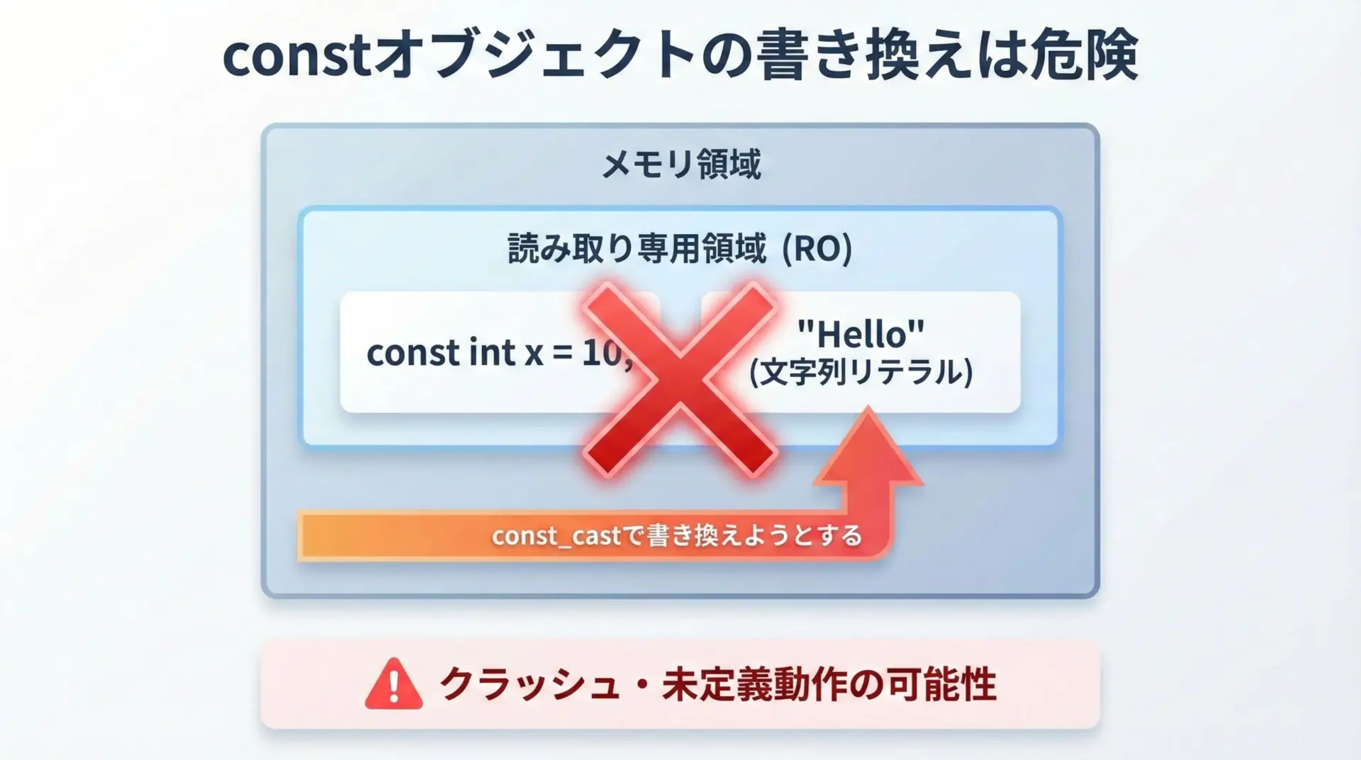 一方で、本当にconstなオブジェクトや文字列リテラルを書き換えると動作未定義になり、大きなバグにつながります。