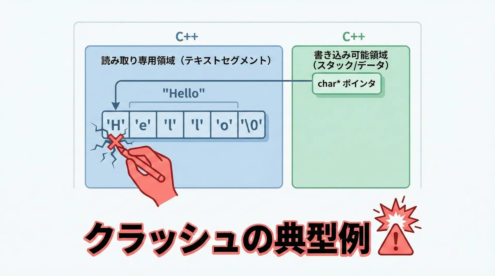 p[0] = 'X'; // 多くの環境でクラッシュ、または未定義動作
