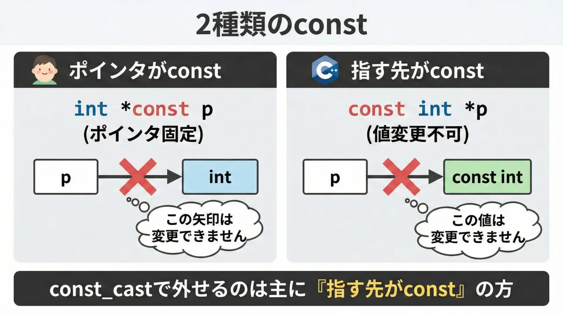 本記事では、C++のconst_castの正しい使い方とやってはいけないNG例を、図解とサンプルコードを用いて丁寧に解説します。